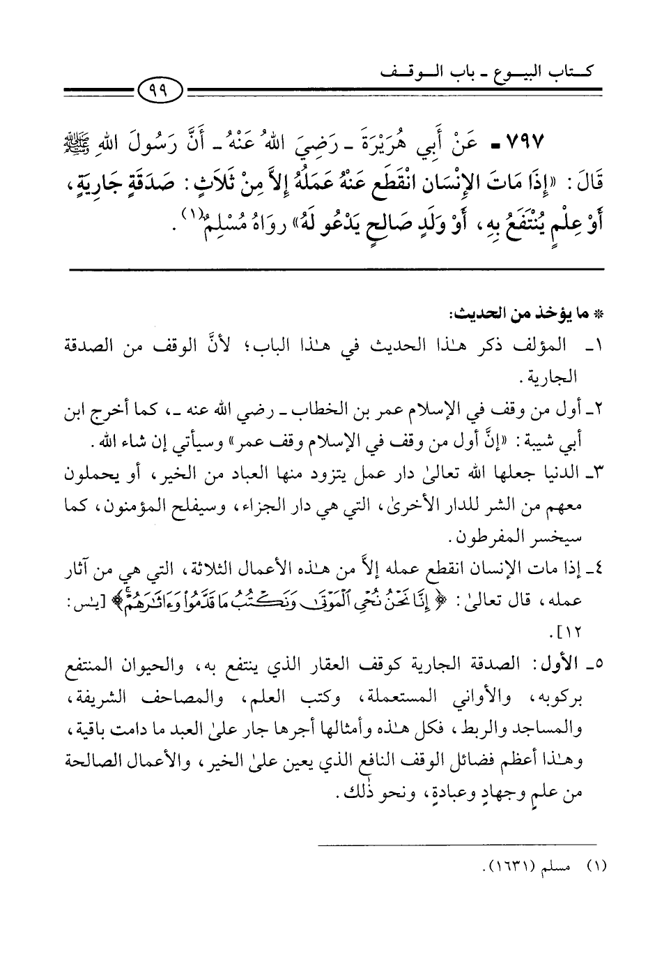 796 - عَنْ أَبِي هُرَيْرَةَ -رَضِيَ اللهُ عَنْهُ- أَنَّ رَسُولَ اللهِ -صلى الله عليه وسلم- قَالَ: "إِذَا مَاتَ الإنْسَان انْقَطَع عَنْهُ عَمَلُهُ إِلاَّ مِنْ ثَلاَثٍ: صَدَقَةٍ جَارِيَةٍ، اوْ عِلْمٍ يُنْتَفَعُ بِهِ، أَوْ وَلَدٍ صَالحٍ يَدْعُو لَهُ" روَاهُ مُسْلِمٌ (¬1).