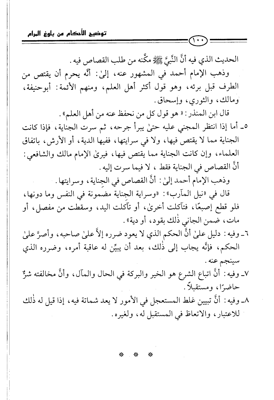 وذهب الإمام أحمد في المشهور عنه، إلى: أنَّه يحرم أن يقتص من الطرف قبل برئه، وهو قول أكثر أهل العلم، ومنهم الأئمة: أبو حنيفة، ومالك، والثوري، وإسحاق.