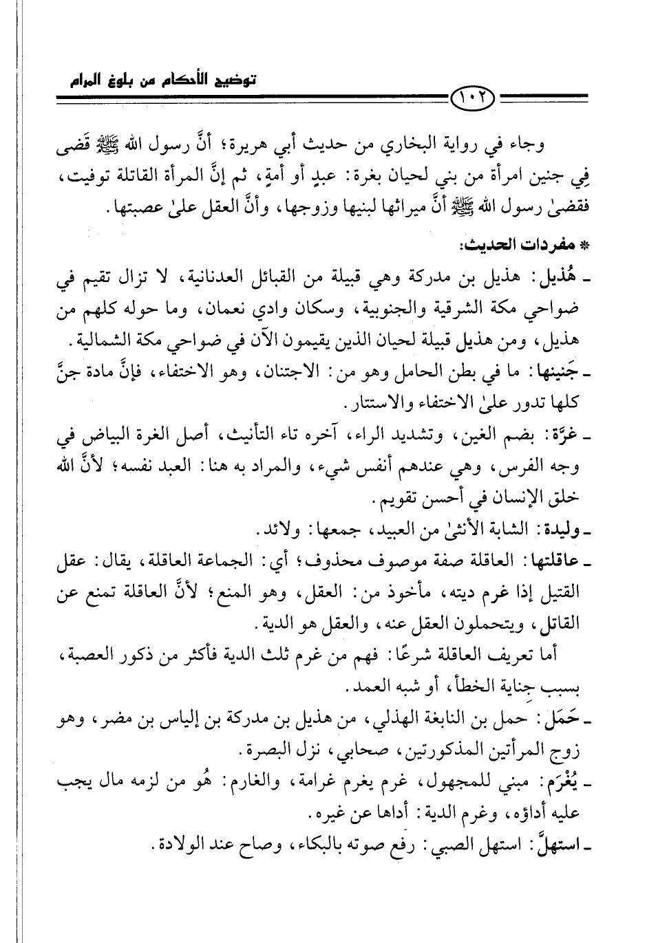- عاقلتها: العاقلة صفة موصوف محذوف؛ أي: الجماعة العاقلة، يقال: عقل القتيل إذا غرم ديته، مأخوذ من: العقل، وهو المنع؛ لأنَّ العاقلة تمنع عن القاتل، ويتحملون العقل عنه، والعقل هو الدية.