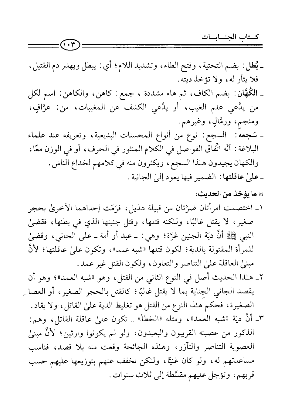 1 - اختصمت امرأتان ضرَّتان من قبيلة هذيل، فرَمَت إحداهما الأخرى بحجر صغير، لا يقتل غالبًا، ولكنه قتلها، وقتل جنينها الذي في بطنها، فقضى النبي -صلى الله عليه وسلم- أنَّ ديَة الجنين غرَّة؛ وهي: -عبد أو أمة- على الجاني، وقضىى للمرأة المقتولة بالدية؛ لكون قتلها "شبه عمد"، وتكون على عاقلتها؛ لأنَّ مبنى العاقلة على التناصر والتعاون، ولكون القتل غير عمد.