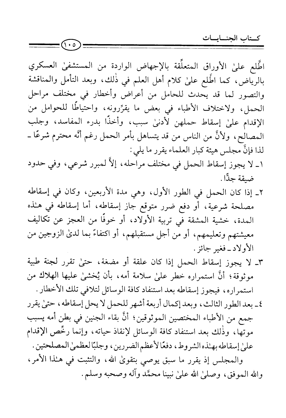 اطَّلع على الأورِاق المتعلِّقة بالإجهاض الواردة من المستشفى العسكري بالرياض، كما اطَّلع على كلام أهل العلم في ذلك، وبعد التأمل والمناقشة والتصور لما قد يحدث للحامل من أعراض وأخطار في مختلف مراحل الحمل، ولاختلاف الأطباء في بعض ما يقرِّرونه، واحتياطًا للحوامل من الإقدام على إسقاط حملهن لأدنى سبب، وأخذًا بدرء المفاسد، وجلب المصالح، ولأنَّ من الناس من قد يتساهل بأمر الحمل رغم أنَّه محرم شرعًا -لذا فإنَّ مجلس هيئة كبار العلماء يقرر ما يلي: