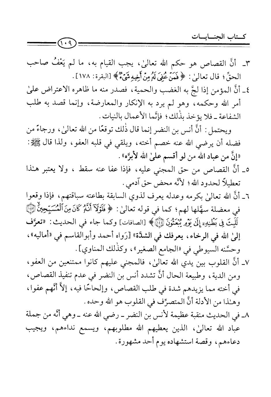 7 - أنَّ القلوب بين يدي الله تعالى، فالمجني عليهم كانوا ممتنعين من العفو، ومن الدية، وطبيعة الحال أنَّ تشدد أنس بن النضر في عدم تنفيذ القصاص، في أخته مما يزيدهم شدة في طلب القصاص، وإلحاحًا فيه، إلاَّ أنَّهم عفوا، وهذا من الأدلة أنَّ المتصرِّف في القلوب هو الله وحده.