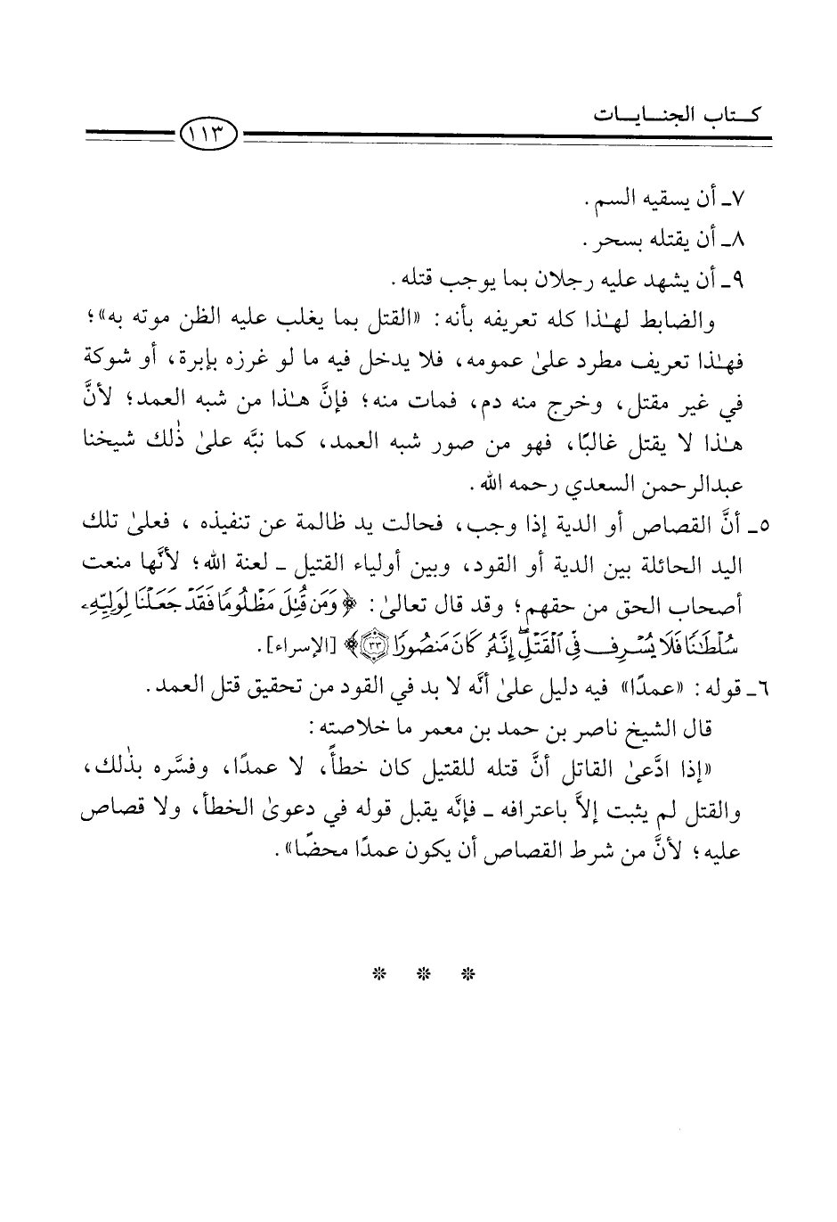 والضابط لهذا كله تعريفه بأنه: "القتل بما يغلب عليه الظن موته به"؛ فهذا تعريف مطرد على عمومه، فلا يدخل فيه ما لو غرزه بإبرة، أو شوكة في غير مقتل، وخرج منه دم، فمات منه؛ فإنَّ هذا من شبه العمد؛ لأنَّ هذا لا يقتل غالبًا، فهو من صور شبه العمد، كما نبَّه على لك شيخنا عبد الرحمن السعدي رحمه الله.
