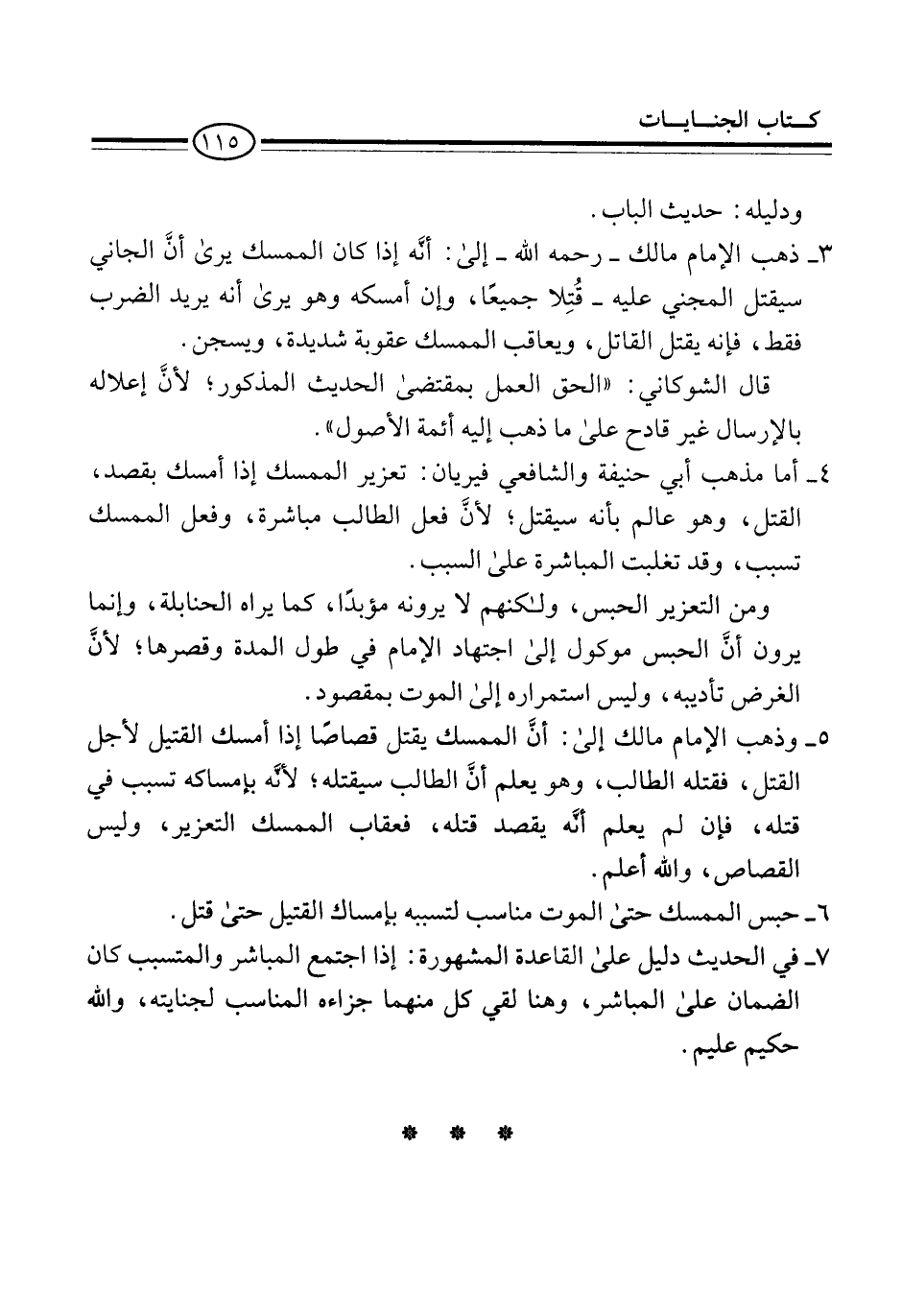 5 - وذهب الإمام مالك إلى: أنَّ الممسك يقتل قصاصًا إذا أمسك القتيل لأجل القتل، فقتله الطالب، وهو يعلم أن الطالب سيقتله؛ لأنَّه بإمساكه تسبب في قتله، فإن لم يعلم أنَّه يقصد قتله، فعقاب الممسك التعزير، وليس القصاص، والله أعلم.