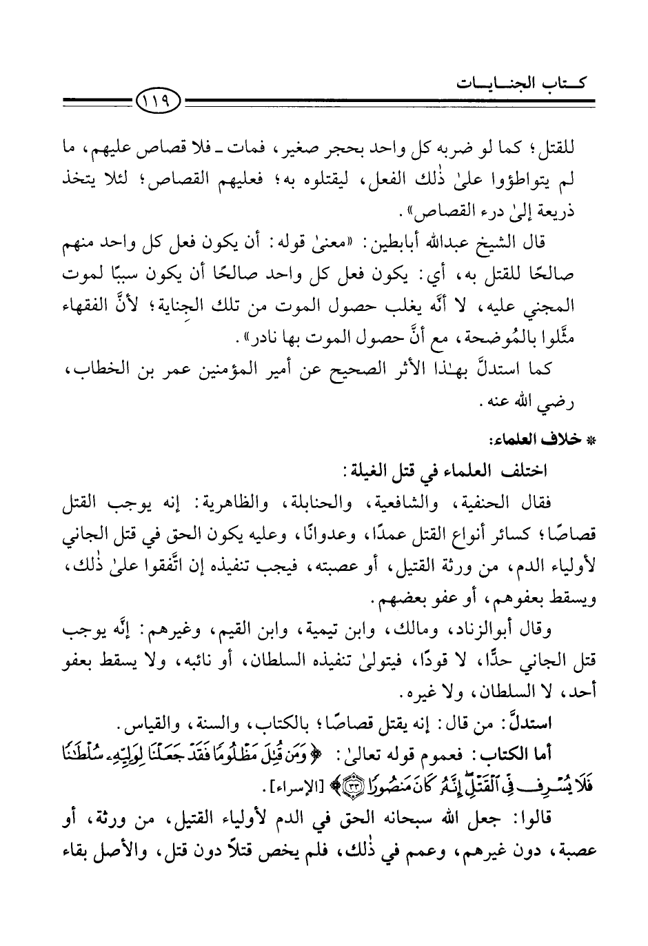 للقتل؛ كما لو ضربه كل واحد بحجر صغير، فمات -فلا قصاص عليهم، ما لم يتواطؤوا على ذلك الفعل، ليقتلوه به؛ فعليهم القصاص؛ لئلا يتخذ ذريعة إلى درء القصاص".