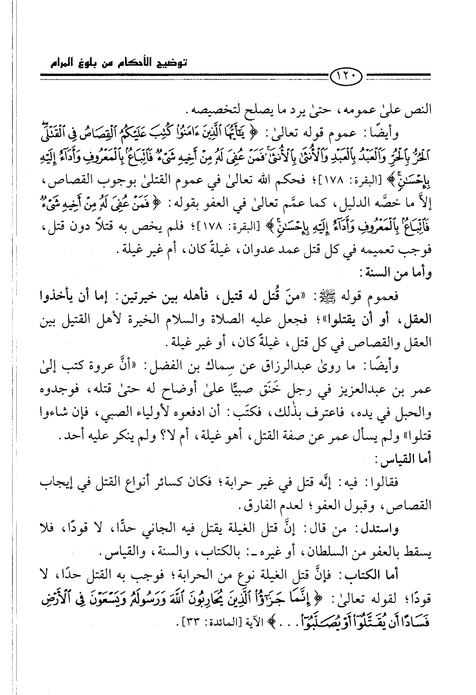 وأيضًا: عموم قوله تعالى: {يَاأَيُّهَا الَّذِينَ آمَنُوا كُتِبَ عَلَيْكُمُ الْقِصَاصُ فِي الْقَتْلَى الْحُرُّ بِالْحُرِّ وَالْعَبْدُ بِالْعَبْدِ وَالْأُنْثَى بِالْأُنْثَى فَمَنْ عُفِيَ لَهُ مِنْ أَخِيهِ شَيْءٌ فَاتِّبَاعٌ بِالْمَعْرُوفِ وَأَدَاءٌ إِلَيْهِ بِإِحْسَانٍ} [البقرة: 178]، فحكم الله تعالى في عموم القتلى بوجوب القصاص، إلاَّ ما خصَّه الدليل، كما عمَّم تعالى في العفو بقوله: {فَمَنْ عُفِيَ لَهُ مِنْ أَخِيهِ شَيْءٌ فَاتِّبَاعٌ بِالْمَعْرُوفِ وَأَدَاءٌ إِلَيْهِ بِإِحْسَانٍ} [البقرة: 178]؛ فلم يخص به قتلًا دون قتل، فوجب تعميمه في كل قتل عمد عدوان، غيلةً كان، أم غير غيلة.
