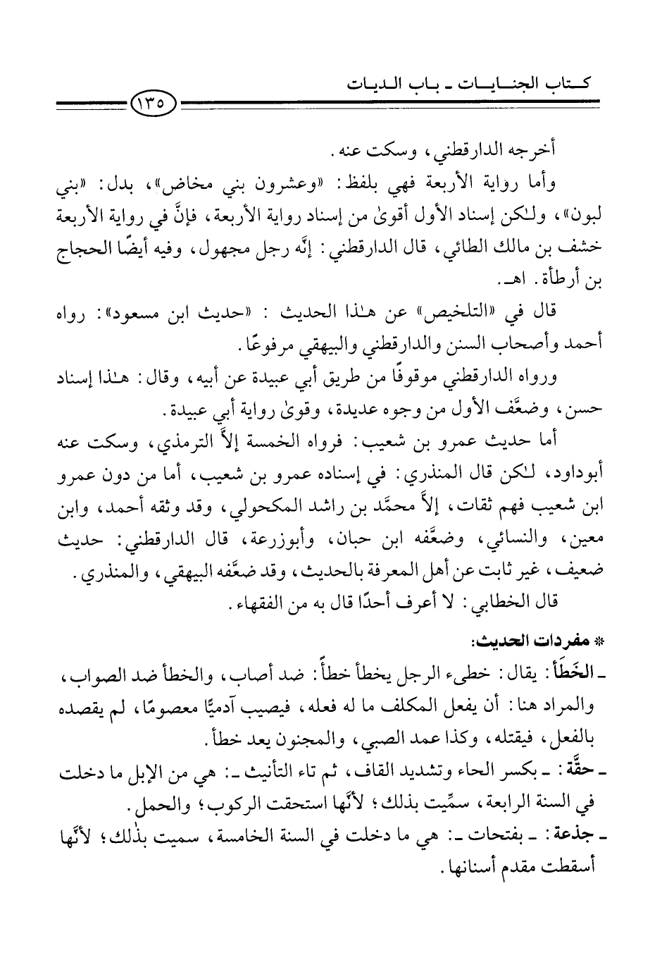 وأما رواية الأربعة فهي بلفظ: "وعشرون بني مخاض"، بدل: "بني لبون"، ولكن إسناد الأول أقوى من إسناد رواية الأربعة، فإنَّ في رواية الأربعة خشف بن مالك الطائي، قال الدارقطني: إنَّه رجل مجهول، وفيه أيضًا الحجاج بن أرطأة. اهـ.