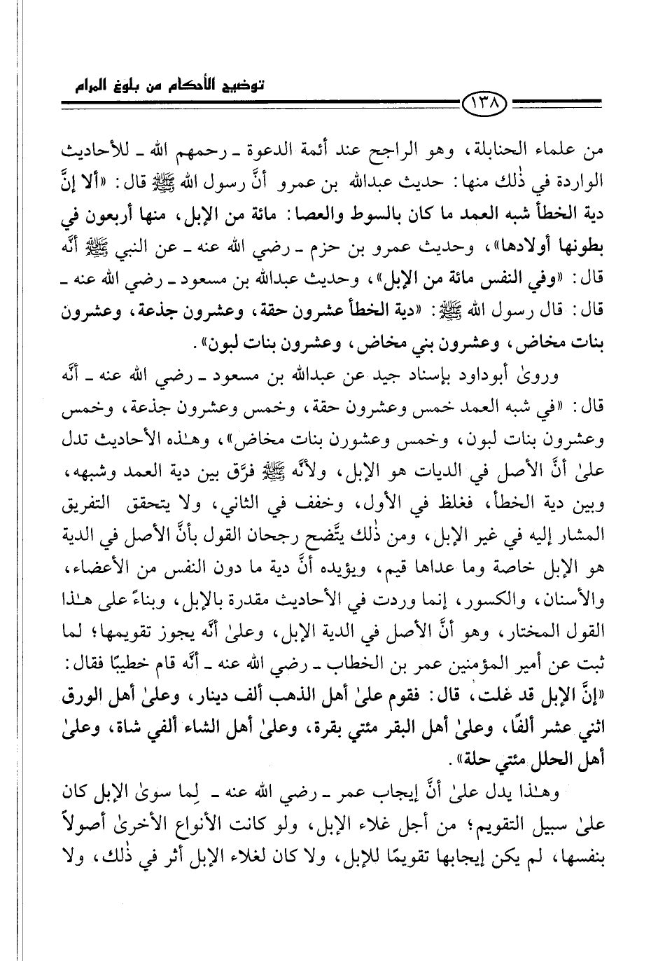 وروى أبو داود بإسناد جيد عن عبد الله بن مسعود -رضي الله عنه- أنَّه قال: "في شبه العمد خمس وعشرون حقة، وخمس وعشرون جذعة، وخمس وعشرون بنات لبون، وخمس وعشرون بنات مخاض"، وهذه الأحاديث تدل على أنَّ الأصل في الديات هو الإبل، ولأنَّه -صلى الله عليه وسلم- فرَّق بين دية العمد وشبهه، وبين دية الخطأ، فغلظ في الأول، وخفف في الثاني، ولا يتحقق التفريق المشار إليه في غير الإبل، ومن ذلك يتَّضح رجحان القول بأنَّ الأصل في الدية هو الإبل خاصة وما عداها قيم، ويؤيده أنَّ دية ما دون النفس من الأعضاء، والأسنان، والكسور، إنما وردت في الأحاديث مقدرة بالإبل، وبناءً على هذا القول المختار، وهو أنَّ الأصل في الدية الإبل، وعلى أنَّه يجوز تقويمها؛ لما ثبت عن أمير المؤمنين عمر بن الخطاب -رضي الله عنه- أنَّه قام خطيبًا فقال: "إنَّ الإبل قد غلت، قال: فقوم على أهل الذهب ألف دينار، وعلى أهل الورق اثني عشر ألفًا، وعلى أهل البقر مئتي بقرة، وعلى أهل الشاء ألفي شاة، وعلى أهل الحلل مئتي حلة".
