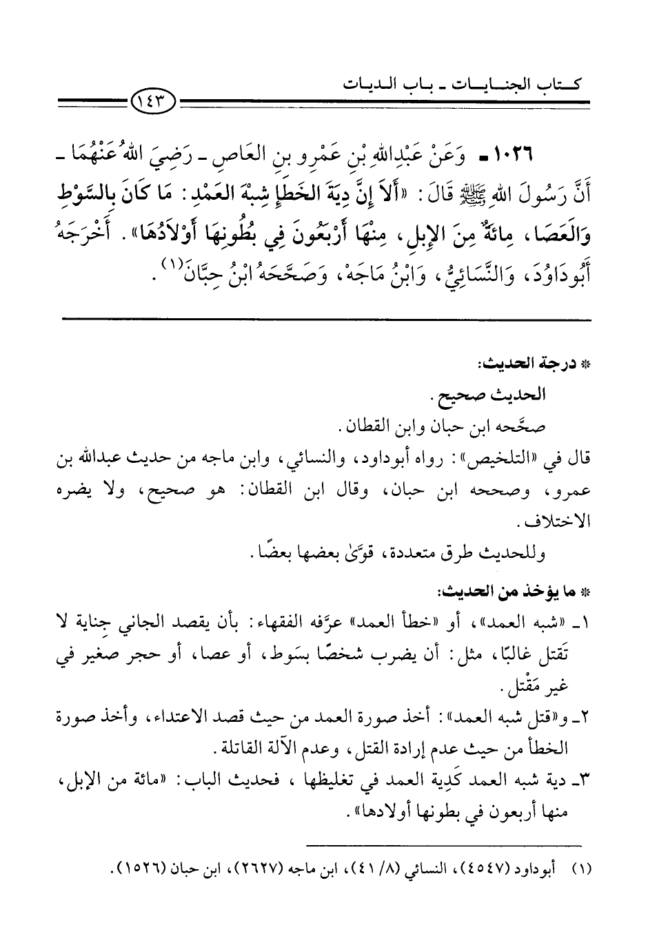1026 - وَعَنْ عَبْدِ اللهِ بْنِ عَمْرِو بنِ العَاصِ -رَضِيَ اللهُ عَنْهُمَا- أَنَّ رَسُولَ اللهِ -صلى الله عليه وسلم- قَالَ: "أَلَا إِنَّ دِيَةَ الخَطَإِ شِبْهَ العَمْدِ: مَا كَانَ بالسَّوْطِ وَالَعَصَا، مِائَةٌ مِنَ الإِبلِ، مِنْهَا أَرْبَعُونَ فِي بُطُونِهَا أَوْلَادُهَا". أَخْرَجَهُ أَبُو دَاوُدَ، وَالنَّسَائِيُّ، وَابْنُ مَاجَهْ، وَصَحَّحَهُ ابْنُ حِبَّانَ (¬1).