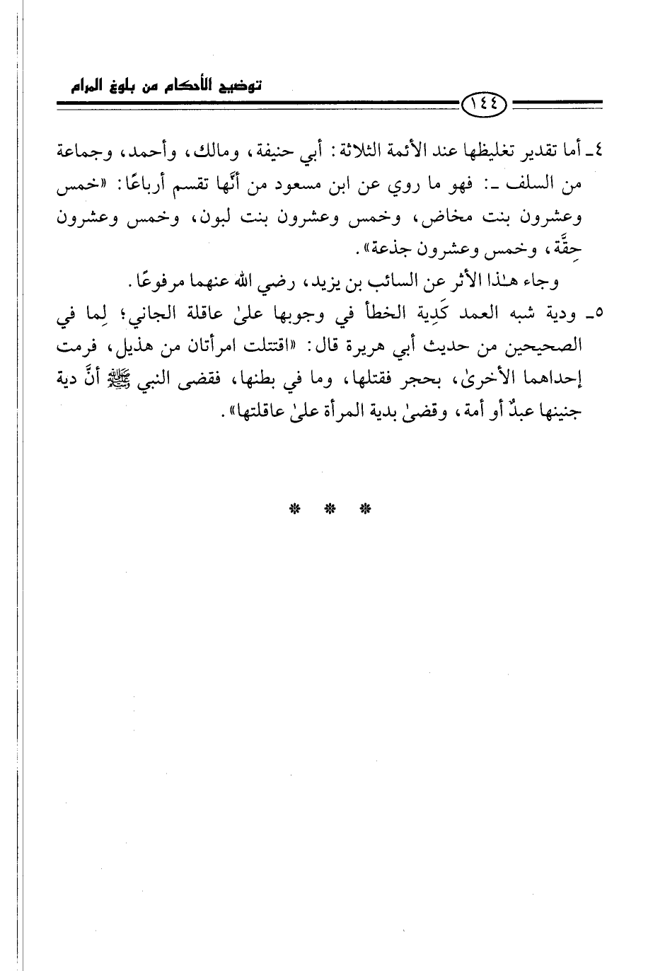 4 - أما تقدير تغليظها عند الأئمة الثلاثة: أبي حنيفة، ومالك، وأحمد، وجماعة من السلف-: فهو ما روي عن ابن مسعود من أنَّها تقسم أرباعًا: "خمس وعشرون بنت مخاض، وخمس وعشرون بنت لبون، وخمس وعشرون حِقَّة، وخمس وعشرون جذعة".