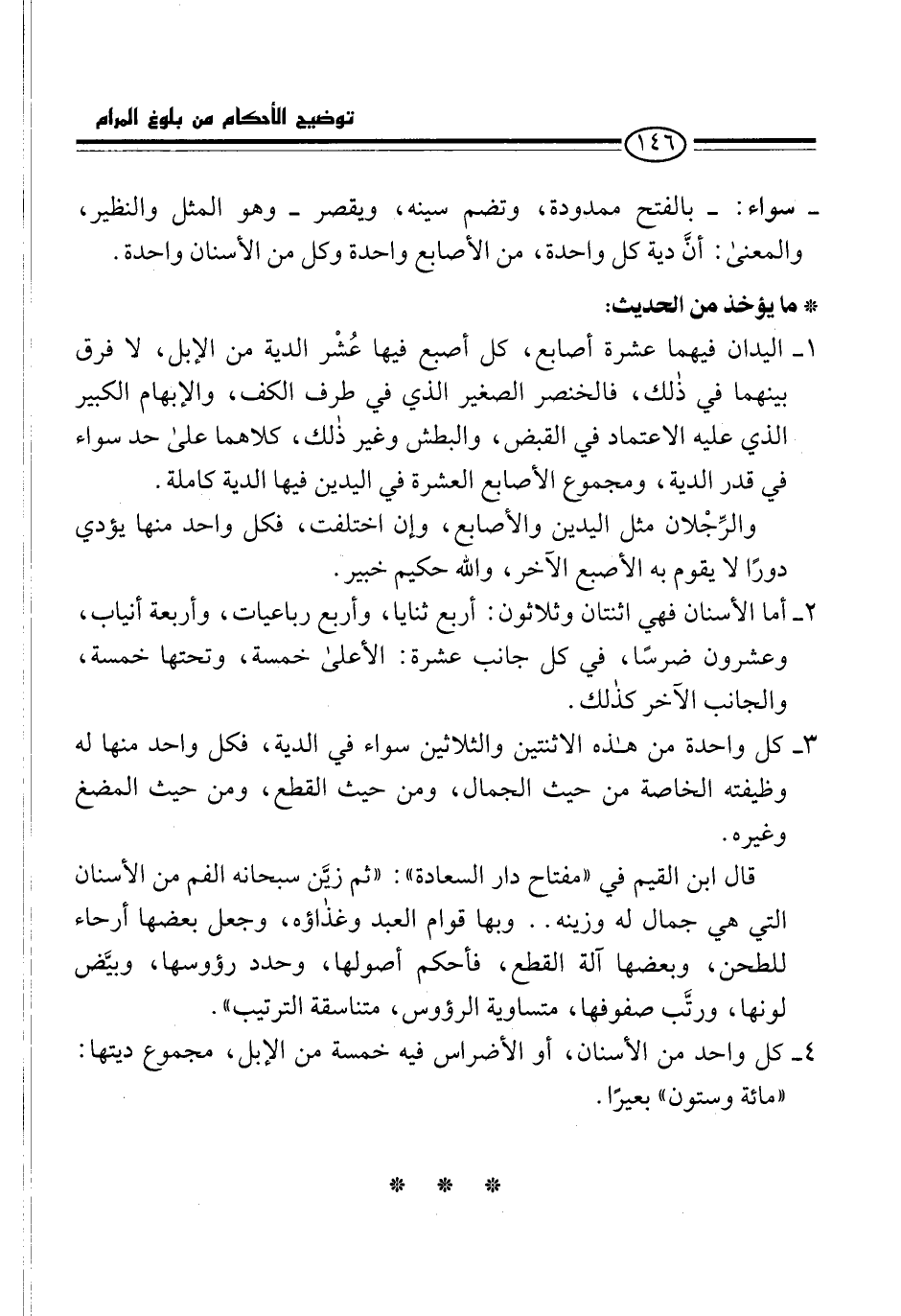 4 - كل واحد من الأسنان، أو الأضراس فيه خمسة من الإبل، مجموع ديتها: "مائة وستون" بعيرًا.