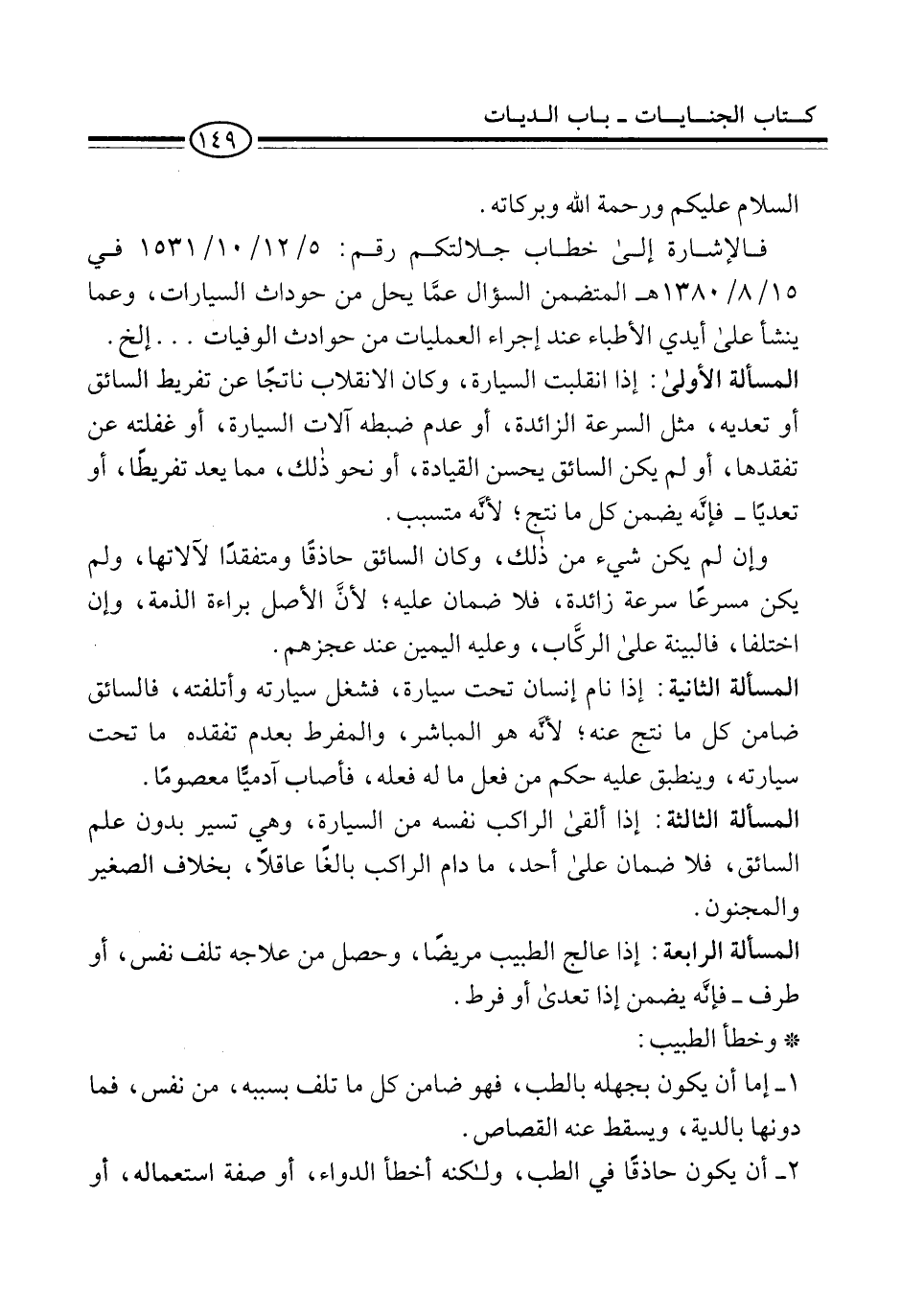 فالإشارة إِلى خطاب جلالتكم رقم: 5/ 12/ 10/ 1531 في 15/ 8/ 1380 هـ المتضمن السؤال عمَّا يحل من حوداث السيارات، وعما ينشأ على أيدي الأطباء عند إجراء العمليات من حوادث الوفيات ... إلخ.