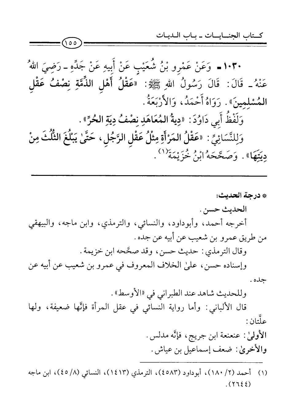 1030 - وَعَنْ عَمْرِو بْنُ شُعَيْبٍ عَنْ أَبيهِ عَنْ جَدِّهِ -رَضِيَ اللهُ عَنْهُ- قَالَ: قَالَ رَسُولُ اللهِ -صلى الله عليه وسلم-: "عَقْلُ أَهْلِ الذِّمَّةِ نِصْفُ عَقْلِ المُسْلِمِينَ". رَوَاهُ أَحْمَدُ، وَالأرْبَعَةُ.