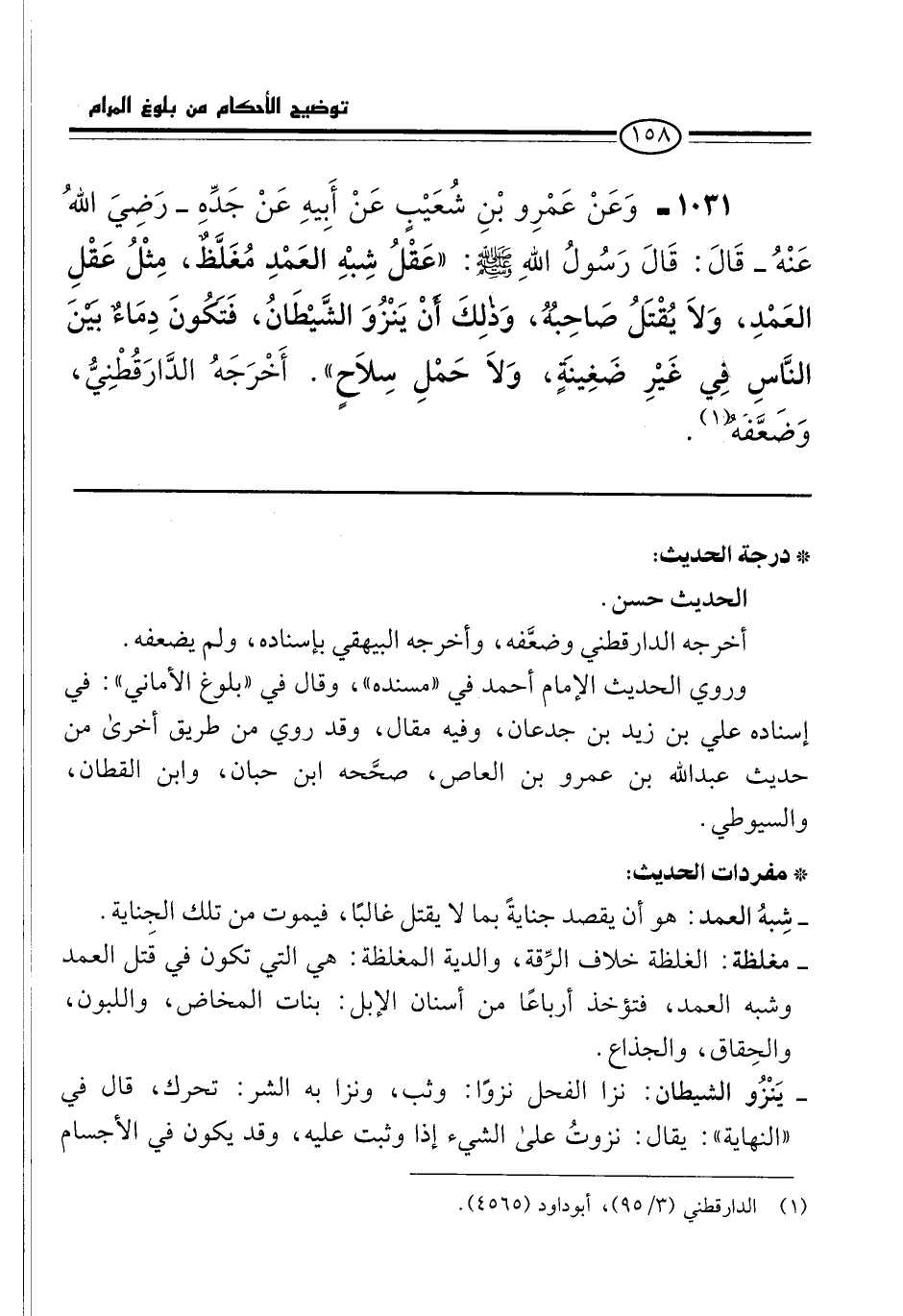 1031 - وَعَنْ عَمْرِو بْنِ شُعَيْبٍ عَنْ أَبِيهِ عَنْ جَدِّهِ -رَضِيَ اللهُ عَنْهُ- قَالَ: قَالَ رَسُولُ اللهِ -صلى الله عليه وسلم-: "عَقْلُ شِبْهِ العَمْدِ مُغَلَّظٌ، مِثْلُ عَقْلِ العَمْدِ، وَلَا يُقْتَلُ صَاحِبُهُ، وَذلِكَ أَنْ يَنْزُوَ الشَّيْطَانُ، فَتَكُونَ دِمَاءٌ بَيْنَ النَّاسِ فِي غَيْرِ ضَغِينَةٍ، وَلَا حَمْلِ سِلَاحٍ". أَخْرَجَهُ الدَّارَقُطْنِيُّ، وَضَعَّفَهُ (¬1).