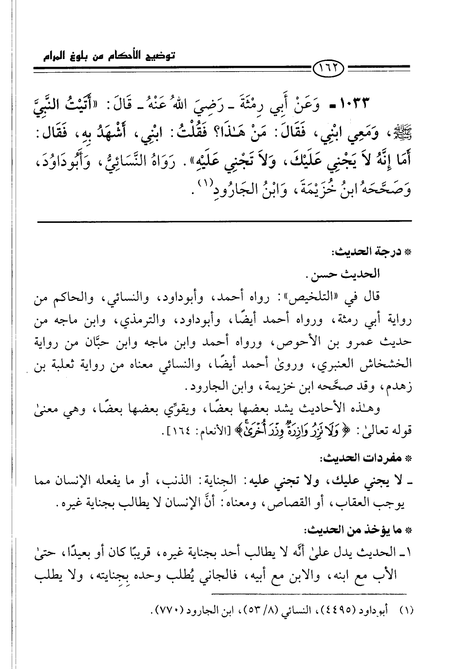 1033 - وَعَنْ أَبي رِمْثَةَ -رَضِيَ اللهُ عَنْهُ- قَالَ: "أَتَيْتُ النَّبِيَّ -صلى الله عليه وسلم-، وَمَعِي ابْنِي، فَقَالَ: مَنْ هَذَا؟ فَقُلْتُ: ابْنِي، أَشْهَدُ بِهِ، فَقَال: أَمَا إِنَّهُ لَا يَجْنِي عَلَيْكَ، وَلَا تَجْنِي عَلَيْهِ". رَوَاهُ النَّسَائِيُّ، وَأَبُو دَاوُدَ، وَصَحَّحَهُ ابنُ خُزَيْمَةَ، وَابْنُ الجَارُودِ (¬1).