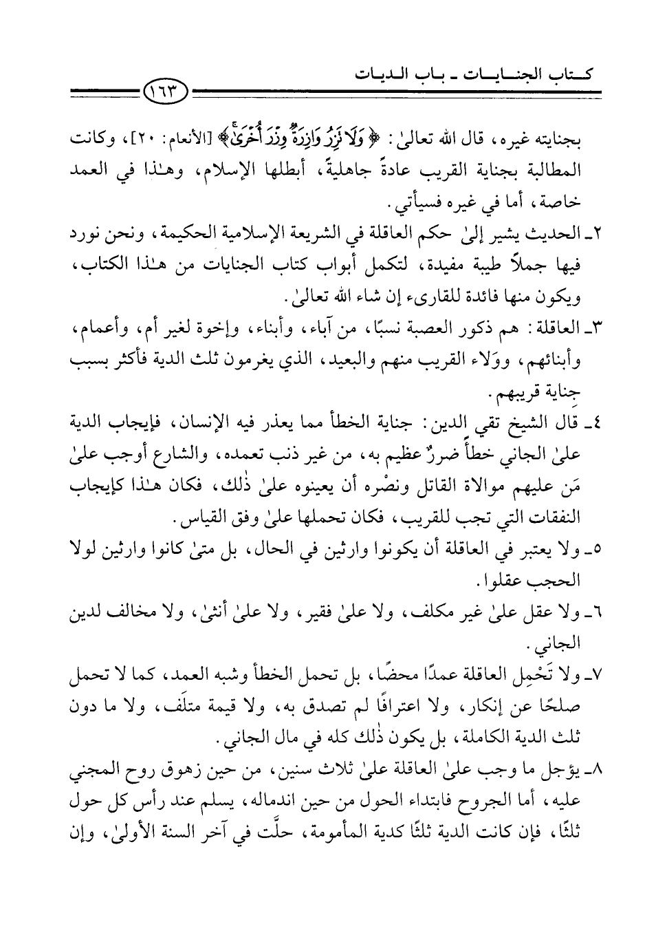 8 - يؤجل ما وجب على العاقلة على ثلاث سنين، من حين زهوق روح المجني عليه، أما الجروح فابتداء الحول من حين اندماله، يسلم عند رأس كل حول ثلثًا، فإن كانت الدية ثلثًا كدية المأمومة، حلَّت في آخر السنة الأولى، وإن