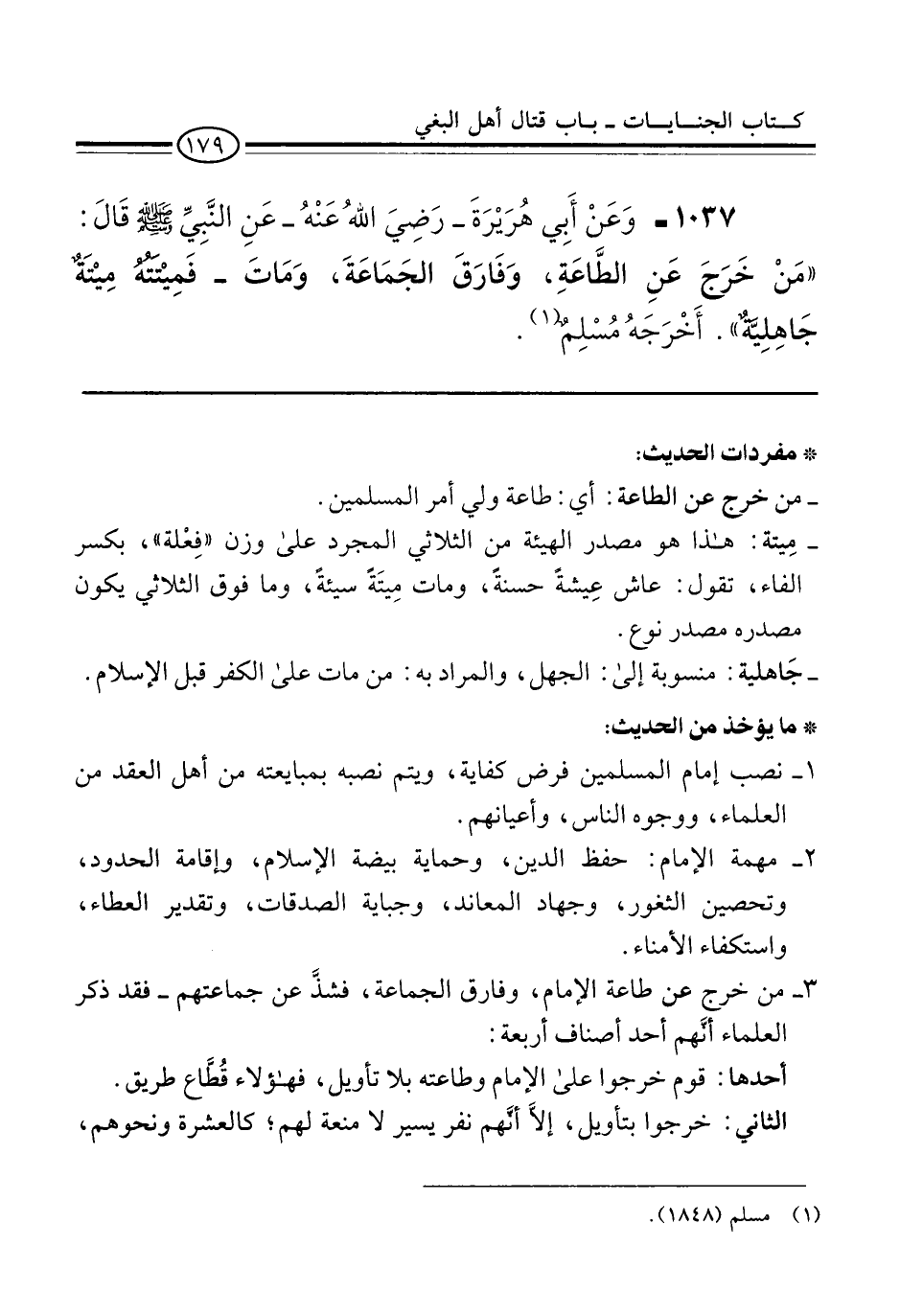 1037 - وَعَنْ أَبِي هُرَيْرَةَ -رَضِيَ اللهُ عَنْهُ- عَنِ النَّبِيِّ -صلى الله عليه وسلم- قَالَ: "مَنْ خَرَجَ عَنِ الطَّاعَةِ، وَفَارَقَ الجَمَاعَةَ، وَمَاتَ -فَمِيْتَتُهُ مِيْتَةٌ جَاهِلِيَّةٌ". أَخْرَجَهُ مُسْلِمٌ (¬1).