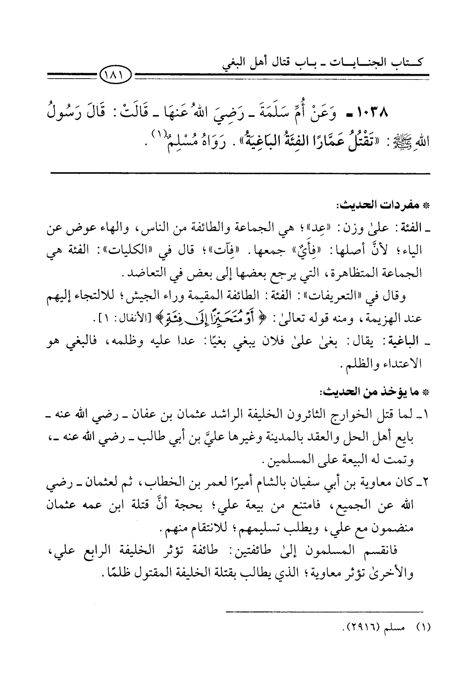 1038 - وَعَنْ أُمِّ سَلَمَةَ -رَضِيَ اللهُ عَنهَا- قَالَتْ: قَالَ رَسُولُ اللهِ -صلى الله عليه وسلم-: "تَقْتُلُ عَمَّارًا الفِئَةُ البَاغِيةُ". رَوَاهُ مُسْلِمٌ (¬1).