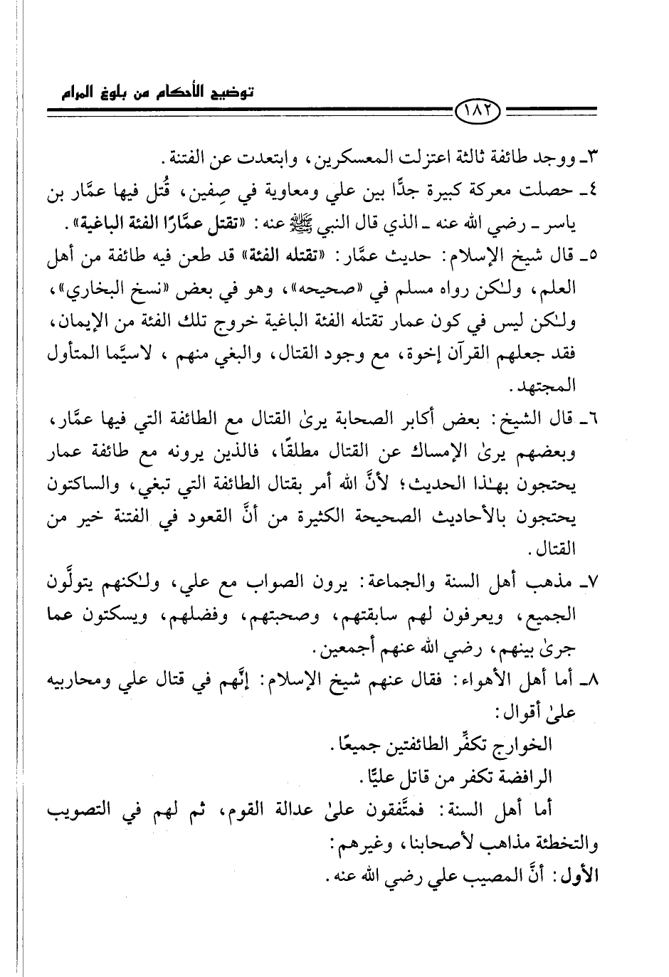 5 - قال شيخ الإسلام: حديث عمَّار: "تقتله الفئة" قد طعن فيه طائفة من أهل العلم، ولكن رواه مسلم في "صحيحه"، وهو في بعض "نسخ البخاري"، ولكن ليس في كون عمار تقتله الفئة الباغية خروج تلك الفئة من الإيمان، فقد جعلهم القرآن إخوة، مع وجود القتال، والبغي منهم، لاسيَّما المتأول المجتهد.