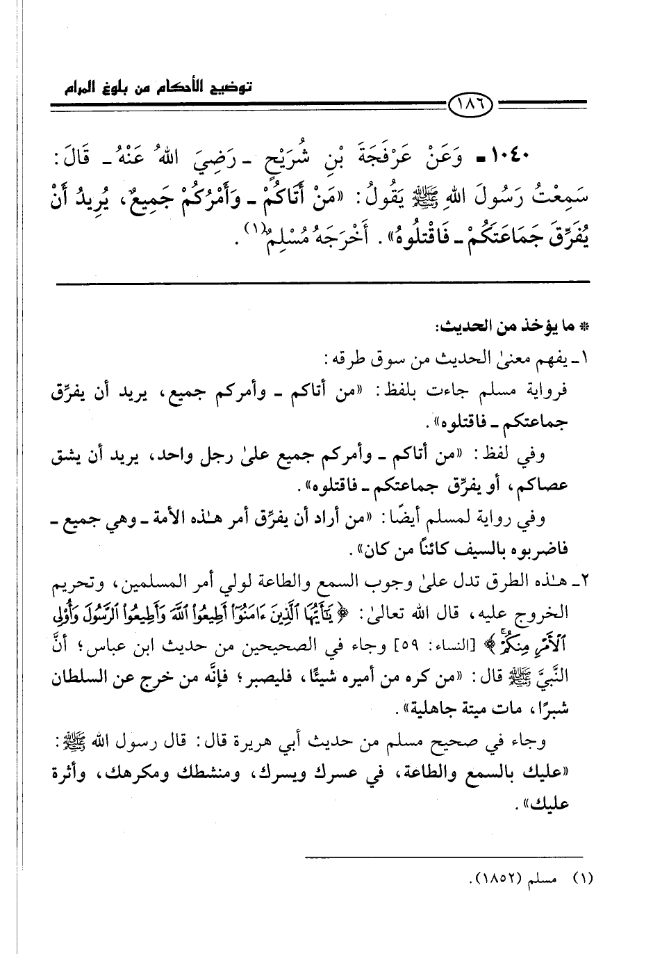 1040 - وَعَنْ عَرْفَجَةَ بْنِ شُرَيْحٍ -رَضِيَ اللهُ عَنْهُ- قَالَ: سَمِعْتُ رَسُولَ اللهِ -صلى الله عليه وسلم- يقُولُ: "مَنْ أَتَاكُمْ -وَأَمْرُكُمْ جَمِيعٌ، يُرِيدُ أَنْ يُفَرِّقَ جَمَاعَتَكُمْ- فَاقْتلُوه". أَخْرَجَهُ مُسْلِمٌ (¬1).