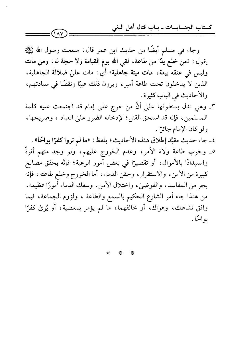وجاء في مسلم أيضًا من حديث ابن عمر قال: سمعت رسول الله -صلى الله عليه وسلم- يقول: "من خلع يدًا من طاعة، لقي الله يوم القيامة ولا حجة له، ومن مات وليس في عنقه بيعة، مات ميتة جاهلية" أي: مات على ضلالة الجاهلية، الذين لا يدخلون تحت طاعة أمير، ويرون ذلك عيبًا ونقصًا في سيادتهم، والأحاديث في الباب كثيرة.