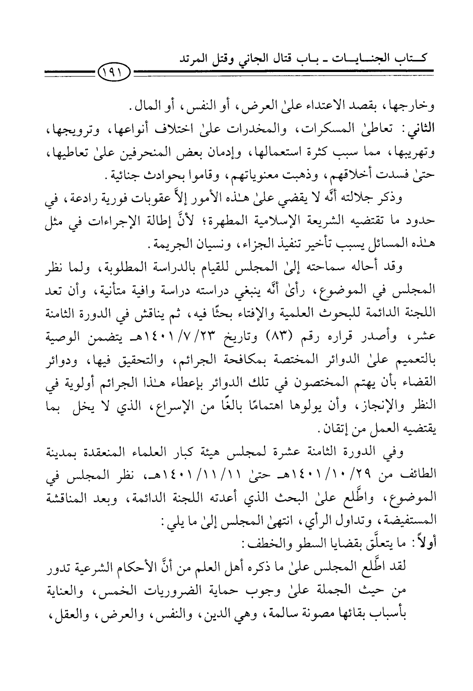وقد أحاله سماحته إِلى المجلس للقيام بالدراسة المطلوبة، ولما نظر المجلس في الموضوع، رأى أنَّه ينبغي دراسته دراسة وافية متأنية، وأن تعد اللجنة الدائمة للبحوث العلمية والإفتاء بحثًا فيه، ثم يناقش في الدورة الثامنة عشر، وأصدر قراره رقم (83) وتاريخ 23/ 7/ 1401 هـ يتضمن الوصية بالتعميم على الدوائر المختصة بمكافحة الجرائم، والتحقيق فيها، ودوائر القضاء بأن يهتم المختصون في تلك الدوائر بإعطاء هذا الجرائم أولوية في النظر والإنجاز، وأن يولوها اهتمامًا بالغًا من الإسراع، الذي لا يخل بما يقتضيه العمل من إتقان.