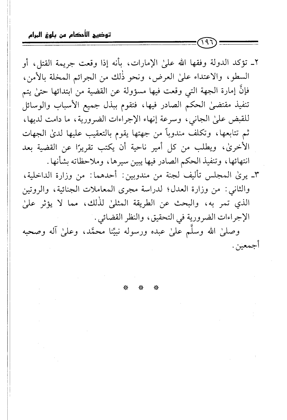2 - تؤكد الدولة وفقها الله على الإمارات، بأنه إذا وقعت جريمة القتل، أو السطو، والاعتداء على العرض، ونحو ذلك من الجرائم المخلة بالأمن، فإنَّ إمارة الجهة التي وقعت فيها مسؤولة عن القضية من ابتدائها حتى يتم تنفيذ مقتضى الحكم الصادر فيها، فتقوم ببذل جميع الأسباب والوسائل للقبض على الجاني، وسرعة إنهاء الإجراءات الضرورية، ما دامت لديها، ثم تتابعها، وتكلف مندوبًا من جهتها يقوم بالتعقيب عليها لدى الجهات الأخرى، ويطلب من كل أمير ناحية أن يكتب تقريرًا عن القضية بعد انتهائها، وتنفيذ الحكم الصادر فيها يبين سيرها، وملاحظاته بشأنها.
