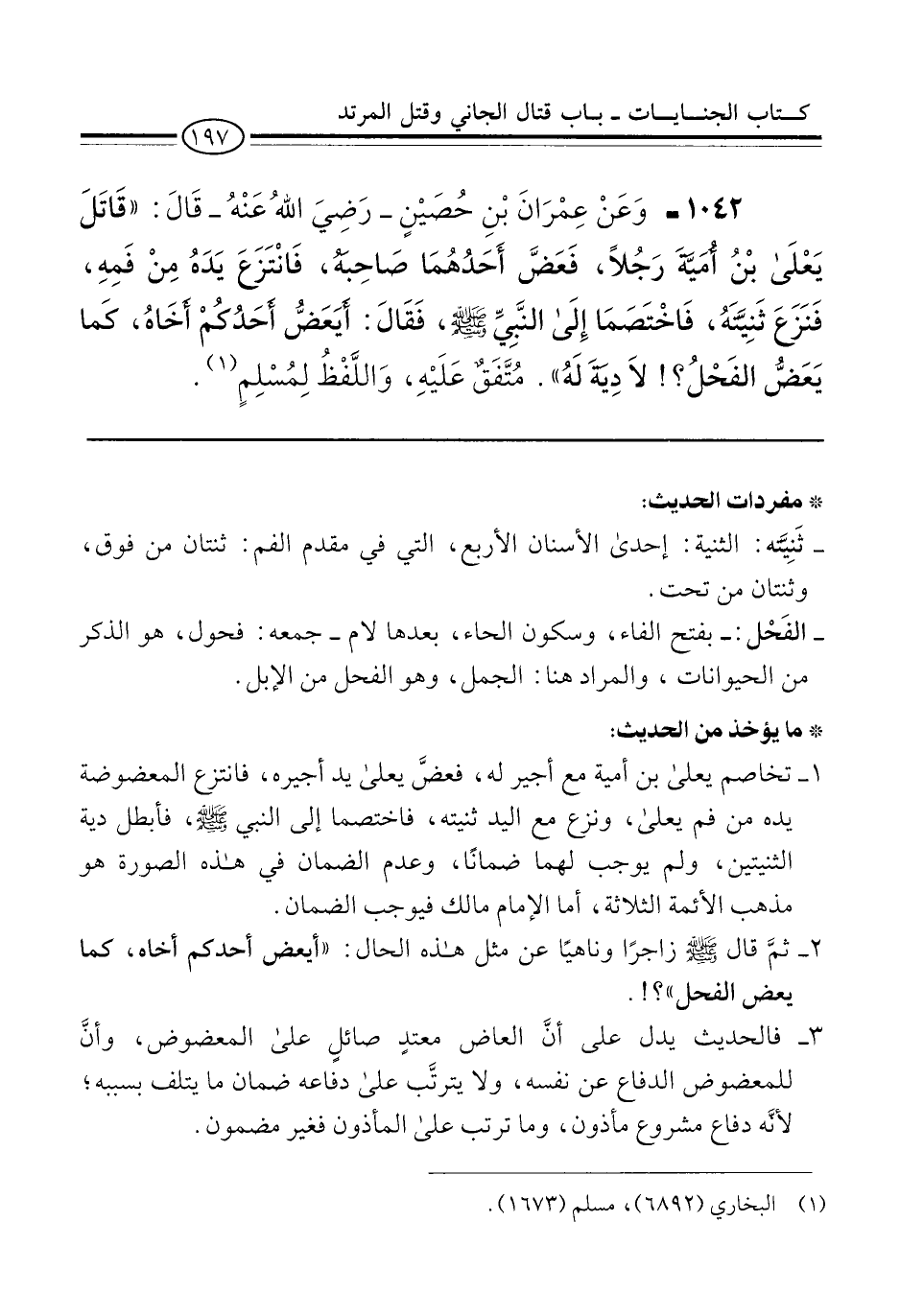 1042 - وَعَنْ عِمْرَانَ بْنِ حُصَيْنٍ -رَضِيَ اللهُ عَنْهُ- قَالَ: "قَاتَلَ يَعْلَى بْنُ أُمَيَّةَ رَجُلًا، فَعَضَّ أَحَدُهُمَا صَاحِبهُ، فَانْتَزَعَ يَدَهُ مِنْ فَمِهِ، فَنَزَعَ ثَنِيَّتَهُ، فَاخْتَصَمَا إِلى النَّبِيِّ -صلى الله عليه وسلم-، فَقَالَ: أَيَعَضُّ أَحَدُكُمْ أَخَاهُ، كَما يَعَضُّ الفَحْلُ؟! لَا دِيَةَ لَهُ". مُتَّفَقٌ عَلَيْهِ، وَاللَّفْظُ لِمُسْلِمٍ (¬1).