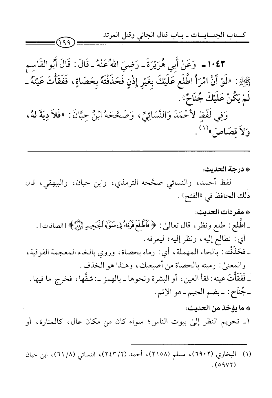 1043 - وَعَنْ أَبِي هُرَيْرَةَ -رَضِيَ اللهُ عَنْهُ- قَالَ: قَالَ أَبُو القَاسِمِ -صلى الله عليه وسلم-: "لَوْ أَنَّ امْرَأً اطَّلَع عَلَيْكَ بِغَيْرِ إِذْنٍ فَحَذَفْتَهُ بِحَصَاةٍ، فَفَقَأْتَ عَيْنَهُ -لَمْ يَكُنْ عَلَيْكَ جُنَاحٌ".