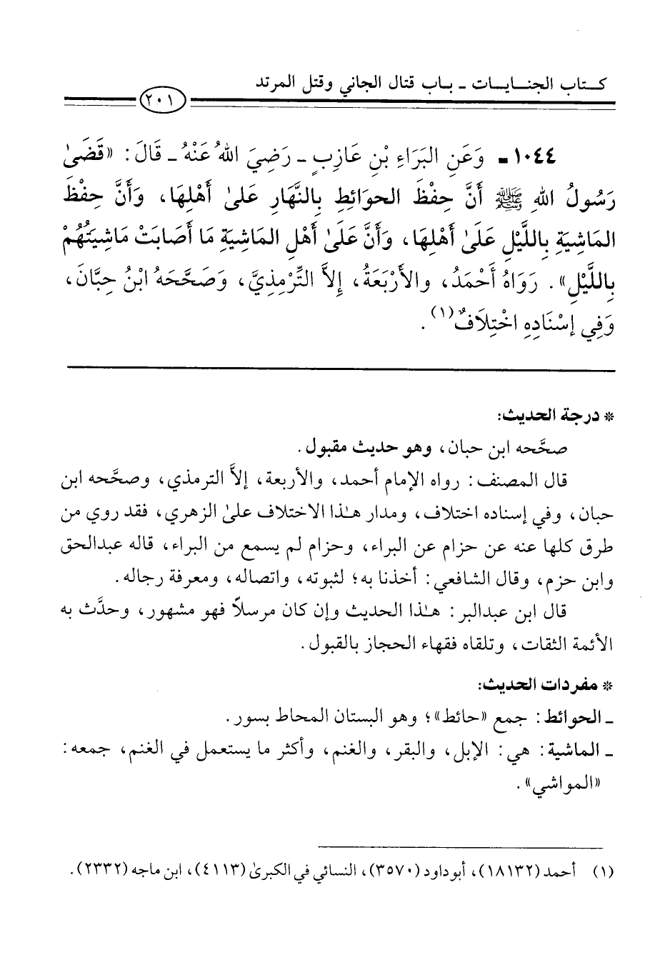 1044 - وَعَنِ البَرَاءِ بْنِ عَازِبٍ -رَضِيَ اللهُ عَنْهُ- قَالَ: "قَضَى رَسُولُ اللهِ -صلى الله عليه وسلم- أَنَّ حِفْظَ الحوَائِطِ بالنَّهَارِ عَلى أَهْلِهَا، وَأَنَّ حِفْظَ المَاشِيَّةِ بِاللَّيْلِ عَلَى أَهْلِهَا، وَأَنَّ عَلَى أَهْلِ المَاشِيَّةِ مَا أَصَابَتْ مَاشِيَتُهُمْ بِاللَّيْلِ". رَوَاهُ أَحْمَدُ، والأَرْبَعَةُ، إِلاَّ التِّرْمِذِيَّ، وَصَحَّحَهُ ابْنُ حِبَّانَ، وَفِي إسْنَادِهِ اخْتِلَافٌ (¬1).