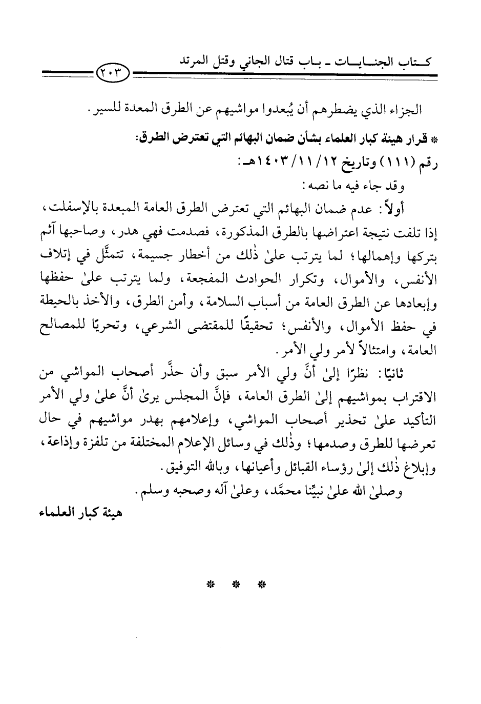 * قرار هيئة كبار العلماء بشأن ضمان البهائم التي تعترض الطرق: