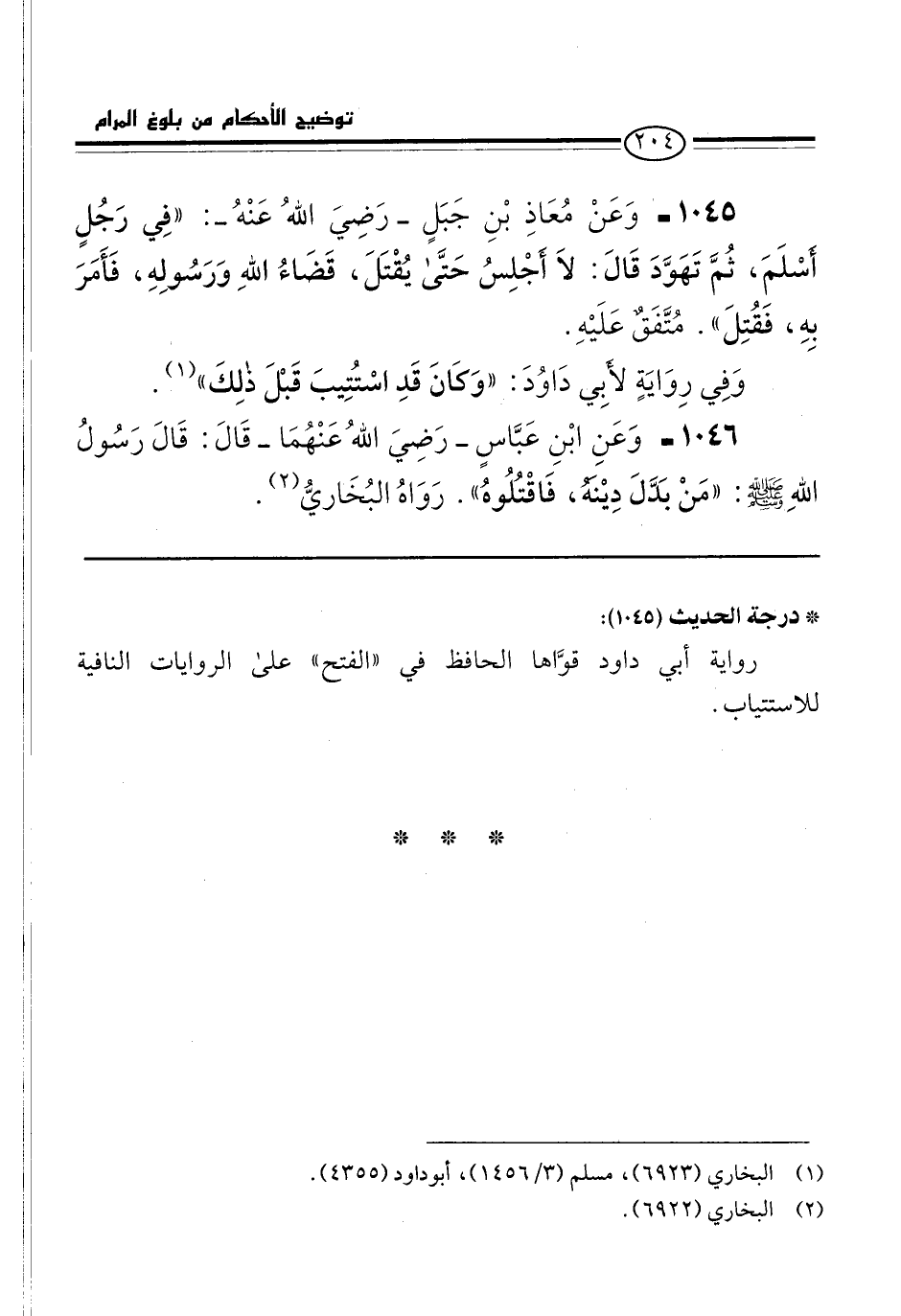 1045 - وَعَنْ مُعَاذِ بْنِ جَبَلٍ -رَضِيَ اللهُ عَنْهُ-: "فِي رَجُلٍ أَسْلَمَ، تُمَّ تَهَوَّدَ قَالَ: لَا أَجْلِسُ حَتَّى يُقْتَلَ، قَضَاءُ اللهِ وَرَسُولِهِ، فَأَمَرَ بِهِ، فَقُتِلَ". مُتَّفَقٌ عَلَيْهِ.
