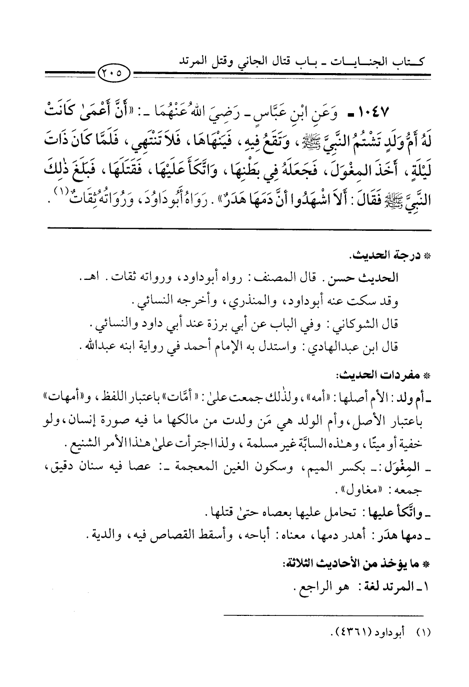 1047 - وَعَنِ ابْنِ عَبَّاسٍ -رَضِيَ اللهُ عَنْهُمَا-: "أَنَّ أَعْمَى كَانَتْ لَهُ أَمُّ وَلَدٍ تَشْتُمُ النَّبِيَّ -صلى الله عليه وسلم-، وَتَقَعُ فِيهِ، فَيَنْهَاهَا، فَلَا تَنْتَهِي، فَلَمَّا كانَ ذَاتَ لَيْلَةٍ، أَخَذَ المِغْوَلَ، فَجَعَلَهُ فِي بَطْنِهَا، وَاتَّكأَ عَلَيْهَا، فَقَتَلَهَا، فَبلَغَ ذلِكَ النَّبِيَّ -صلى الله عليه وسلم- فقَالَ: أَلَا اشْهَدُوا أنَّ دَمَهَا هَدَرٌ". رَوَاهُ أَبُوْ دَاوُدَ، وَرُوَاتُهُ ثِقَاتٌ (¬1).