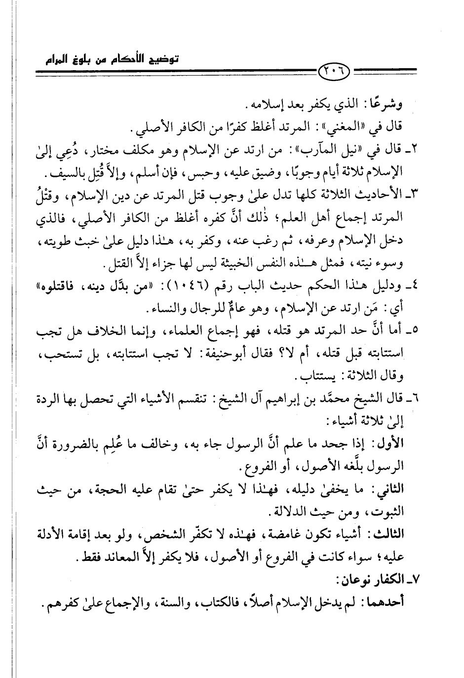 6 - قال الشيخ محمَّد بن إبراهيم آل الشيخ: تنقسم الأشياء التي تحصل بها الردة إلى ثلاثة أشياء: