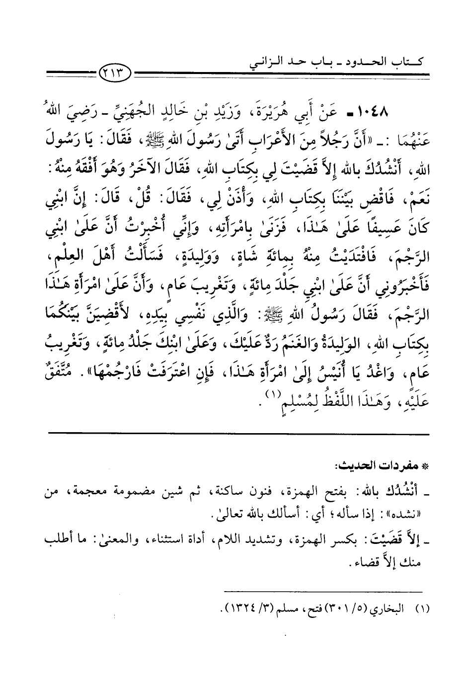1048 - عَنْ أَبِي هُرَيْرَةَ، وَزَيْدِ بْنِ خَالِدٍ الجُهَنِيِّ -رَضِيَ اللهُ عَنْهُمَا-: "أَنَّ رَجُلًا مِنَ الأَعْرَابِ أَتَي رَسُولَ اللهِ -صلى الله عليه وسلم- فَقَالَ: يَا رَسُولَ اللهِ، أَنْشُدُكَ بالله إِلاَّ قَضَيْتَ لِي بِكِتَابِ اللهِ، فَقَالَ الآخَرُ وَهُوَ أَفْقَهُ مِنْهُ: نَعَم، فَاقْضِ بَيْنَنَا بِكِتَابِ اللهِ، وَأَذَنْ لِي، فَقَالَ: قُلْ، قَالَ: إِنَّ ابْنِي كَان عَسِيفًا عَلَى هَذَا، فَزَنَى بِامْرَأَتِهِ، وَإِنِّي أُخْبِرْتُ أَنَّ عَلَى ابْنِي الرَّجْمَ، فَافْتَدَيْتُ مِنْهُ بِمِائَةِ شَاةٍ، وَوَلِيدَةٍ، فَسَأَلْتُ أَهْلَ العِلْمِ، فَأَخْبَرُونِي أَنَّ عَلَى ابْنِيِ جَلْدَ مِائَةٍ، وَتَغْرِيبَ عَامٍ، وَأَنَّ عَلَى امْرَأَةِ هَذَا الرَّجْمَ، فَقَالَ رَسُولُ اللهِ -صلى الله عليه وسلم-: وَالَّذِي نَفْسِي بِيَدِهِ، لأَقْضِيَنَّ بَيْنَكَمَا بِكِتَابِ اللهِ، الوَلِيدَةُ وَالغَنَمُ رَدٌّ عَلَيْكَ، وَعَلَى ابْنِكَ جَلْدُ مِائَةٍ، وَتَغْرِيبُ عَامٍ، وَاغْدُ يَا أُنَيْسُ إِلى امْرَأَةِ هَذَا، فَإِنِ اعْتَرَفَتْ فَارْجُمْهَا". مُتَّفَقٌ عَلَيْهِ، وَهَذَا اللَّفْظُ لِمُسْلِمٍ (¬1).