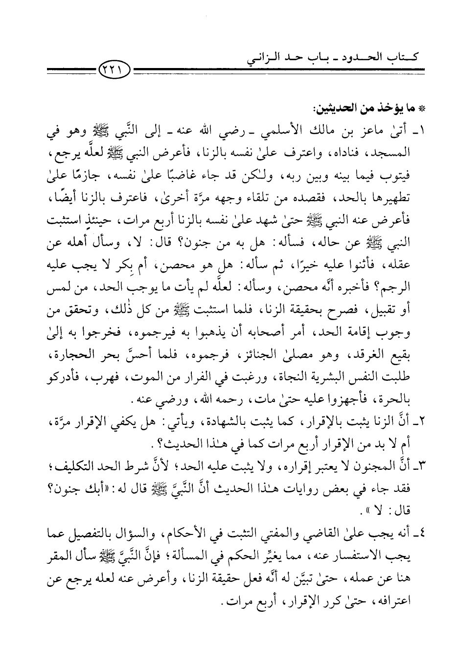 3 - أنَّ المجنون لا يعتبر إقراره، ولا يثبت عليه الحد؛ لأنَّ شرط الحد التكليف؛ فقد جاء في بعض روايات هذا الحديث أنَّ النَّبيَّ -صلى الله عليه وسلم- قال له: "أبك جنون؟ قال: لا".