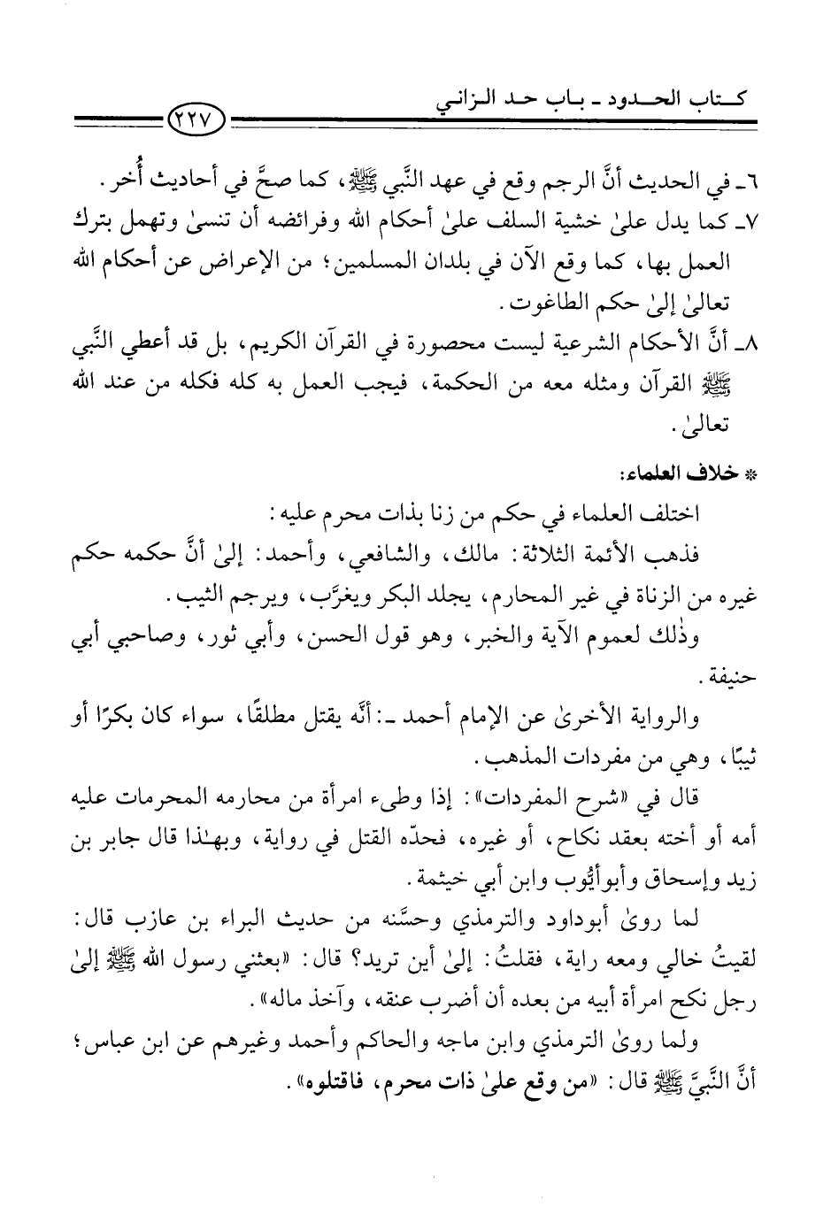 ولما روى الترمذي وابن ماجه والحاكم وأحمد وغيرهم عن ابن عباس؛ أنَّ النَّبيَّ -صلى الله عليه وسلم- قال: "من وقع على ذات محرم، فاقتلوه".