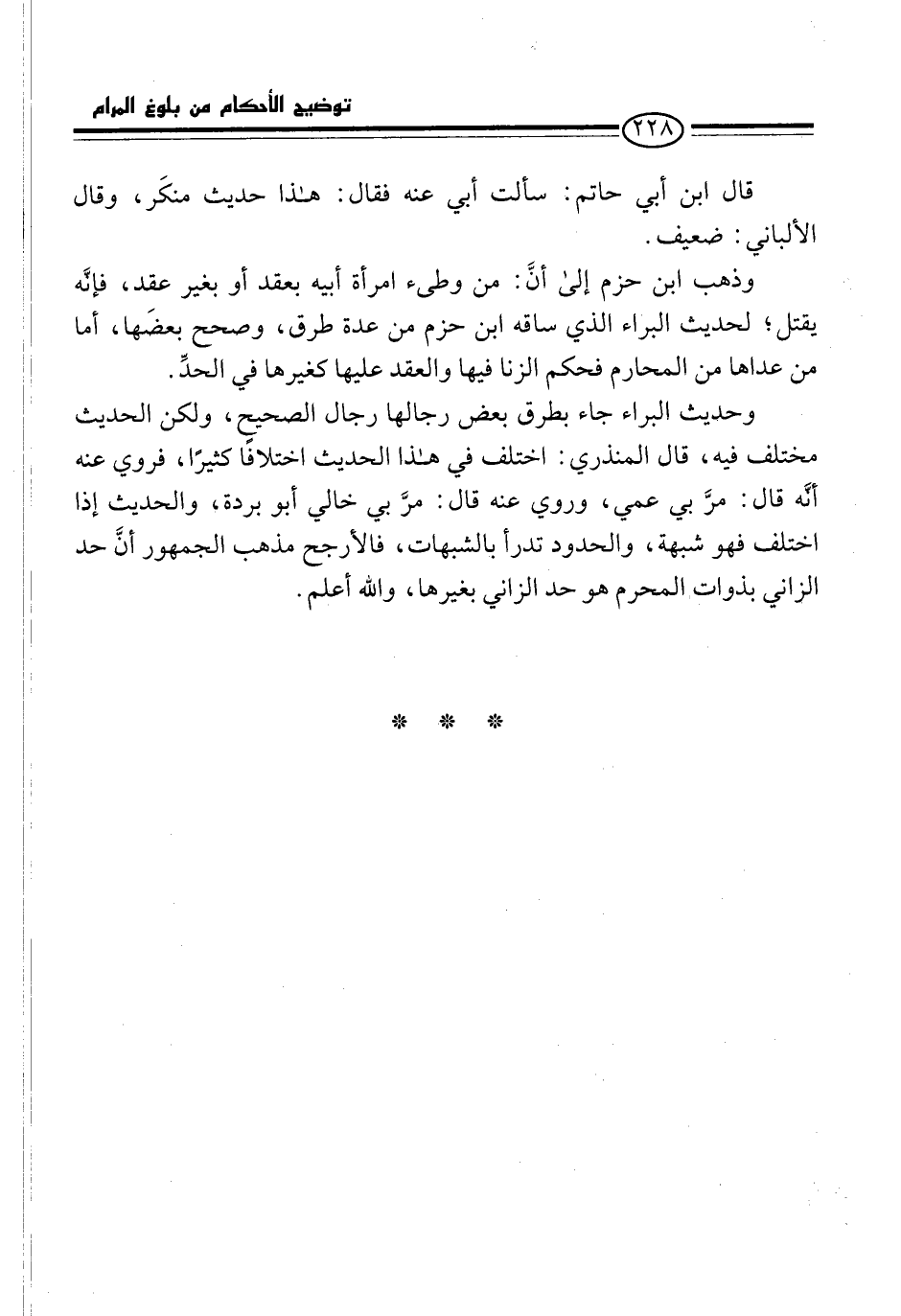 وحديث البراء جاء بطرق بعض رجالها رجال الصحيح، ولكن الحديث مختلف فيه، قال المنذري: اختلف في هذا الحديث اختلافًا كثيرًا، فروي عنه أنَّه قال: مرَّ بي عمي، وروي عنه قال: مرَّ بي خالي أبو بردة، والحديث إذا اختلف فهو شبهة، والحدود تدرأ بالشبهات، فالأرجح مذهب الجمهور أنَّ حد الزاني بذوات المحرم هو حد الزاني بغيرها، والله أعلم.
