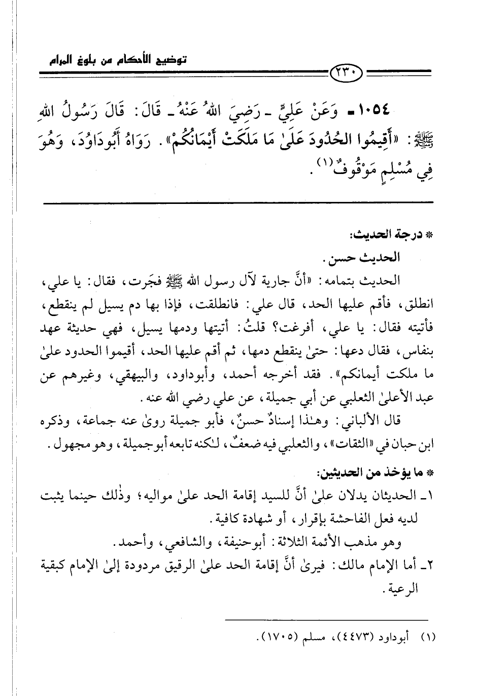 1054 - وَعَنْ عَلِيٍّ -رَضِيَ اللهُ عَنْهُ- قَالَ: قَالَ رَسُولُ اللهِ -صلى الله عليه وسلم-: "أَقِيمُوا الحُدُودَ عَلَى مَا مَلَكَتْ أَيْمَانُكُمْ". رَوَاهُ أَبُو دَاوُدَ، وَهُوَ فِي مُسْلِمٍ مَوْقُوفٌ (¬1).