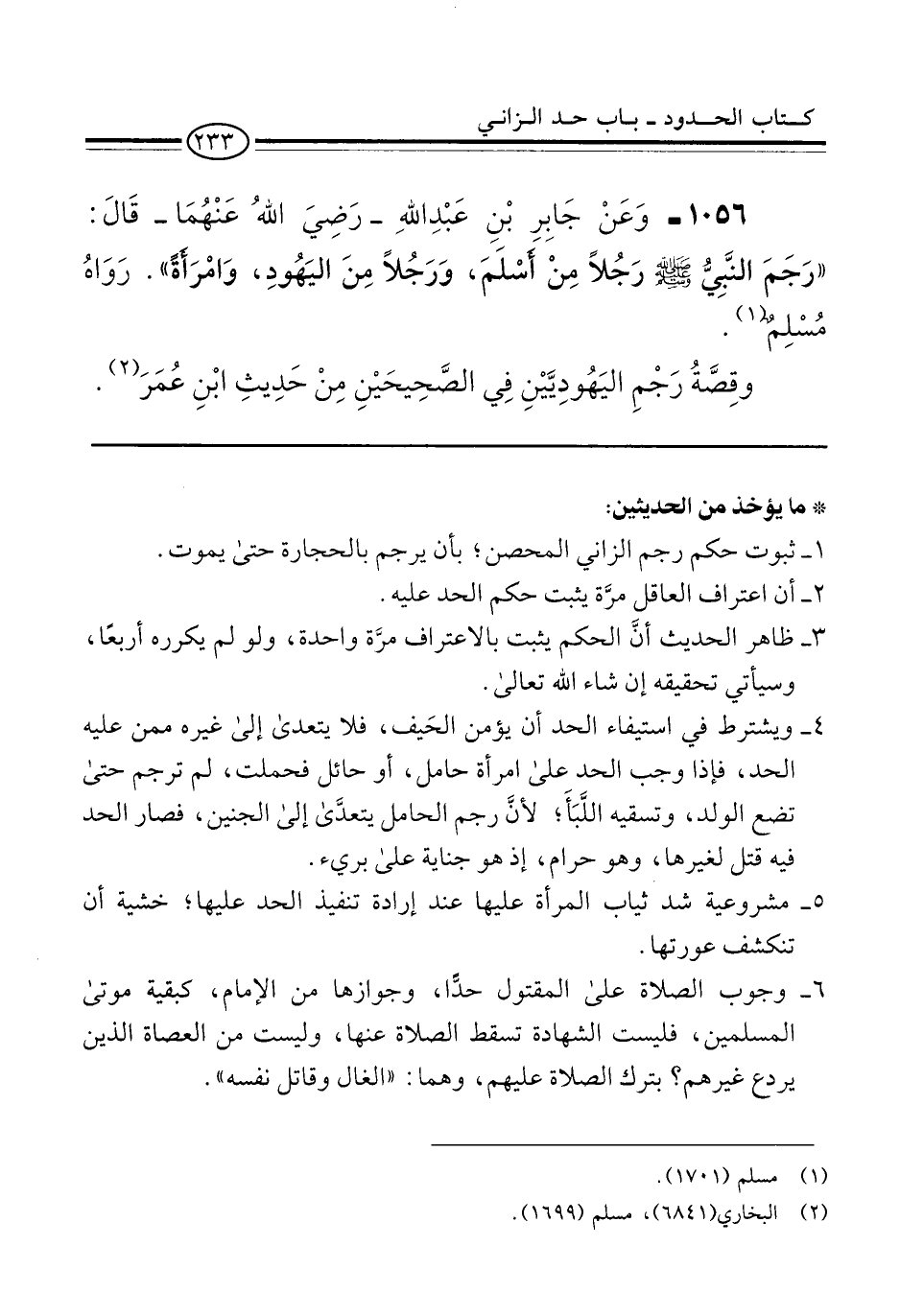 1056 - وَعَنْ جَابِرِ بْنِ عَبْدِ اللهِ -رَضِيَ اللهُ عَنْهُمَا- قَالَ: "رَجَمَ النَّبِيُّ -صلى الله عليه وسلم- رَجُلاً مِنْ أَسْلَمَ، وَرَجُلاً مِنَ اليَهُودِ، وَامْرَأةً". رَوَاهُ مُسْلِمٌ (¬1).