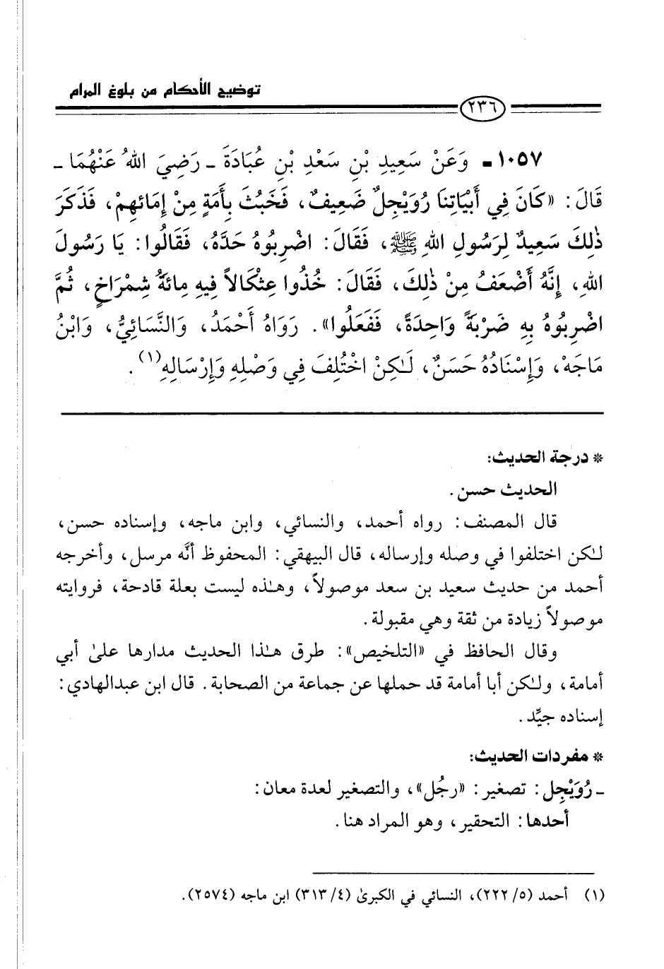1057 - وَعَنْ سَعِيدِ بْنِ سَعْدِ بْنِ عُبَادَةَ -رَضِيَ اللهُ عَنْهُمَا- قَالَ: "كانَ فِي أَبْيَاتِنَا رُوَيْجِلٌ ضَعِيفٌ، فَخَبُثَ بِأَمَةٍ مِنْ إِمَائهِمْ، فَذَكرَ ذلِكَ سَعِيدٌ لِرَسُولِ اللهِ -صلى الله عليه وسلم-، فَقَالَ: اضرِبُوهُ حَدَّهُ، فَقَالُوا: يَا رَسُولَ اللهِ، انَّهُ أَضْعَفُ مِنْ ذلِكَ، فَقَالَ: خُذُوا عِثْكَالاً فِيهِ مِائهٌ شِمْرَاخٍ، ثُمَّ اضْرِبُوهُ بِهِ ضَرْبةً وَاحِدَةً، فَفَعَلُوا". رَوَاهُ أَحْمَدُ، وَالنَّسَائِيُّ، وَابْنُ مَاجَهْ، وإِسْنَادُهُ حَسَنٌ، لَكِنْ اخْتُلِفَ فِي وَصْلِهِ وَإِرْسَالِهِ (¬1).