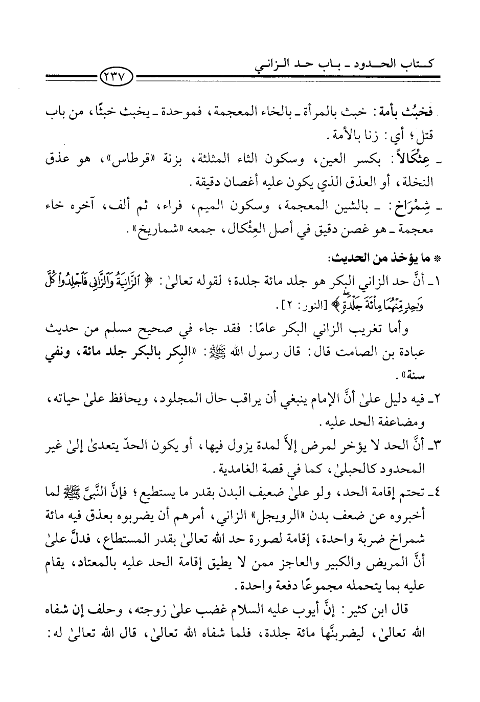 1 - أنَّ حد الزاني البكر هو جلد مائة جلدة؛ لقوله تعالى: {الزَّانِيَةُ وَالزَّانِي فَاجْلِدُوا كُلَّ وَاحِدٍ مِنْهُمَا مِائَةَ جَلْدَةٍ} [النور: 2].