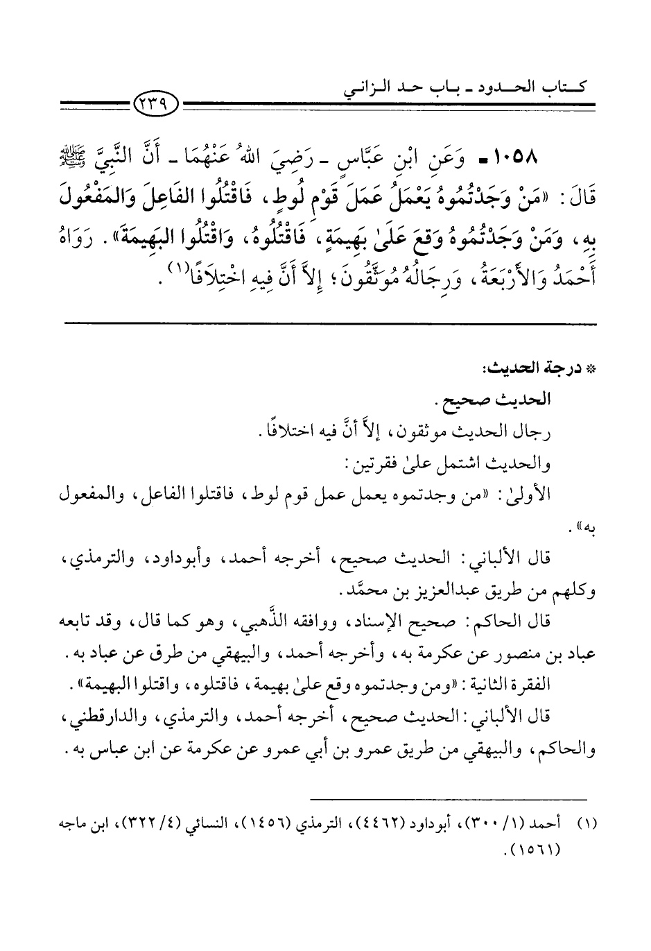 1058 - وَعَنِ ابْنِ عَبَّاسٍ -رَضِيَ اللهُ عَنْهُمَا- أَنَّ النَّبِيَّ -صلى الله عليه وسلم- قَالَ: "مَنْ وَجَدْتُمُوهُ يَعْمَلُ عَمَلَ قَوْمِ لُوطٍ، فَاقْتُلُوا الفَاعِلَ وَالمَفْعُولَ بهِ، وَمَنْ وَجَدْتُمُوهُ وَقعَ عَلَى بَهِيمَةٍ، فَاقْتُلُوهُ، وَاقْتُلُوا البَهِيمَةَ". رَوَاهُ أَحْمَدُ وَالأرْبَعَةُ، وَرِجَالُهُ مُوَثَّقُونَ، إِلاَّ أَنَّ فِيهِ اخْتِلاَفًا (¬1).