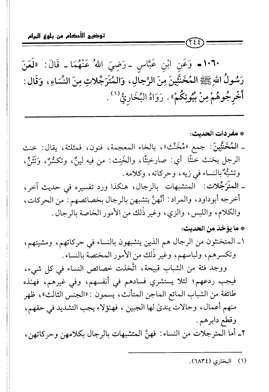 1060 - وَعَنِ ابْنِ عَبَّاسٍ -رَضِيَ اللهُ عَنْهُمَا- قَالَ: "لَعَنَ رَسُولُ اللهِ -صلى الله عليه وسلم- المُخَنَّثِينَ مِنَ الرِّجالِ، وَالمُتَرَجِّلاتِ مِنَ النِّسَاءِ، وَقَال: أَخْرِجُوهُمْ مِنْ بُيُوتكُمْ". رَوَاهُ البُخَارِيُّ (¬1).