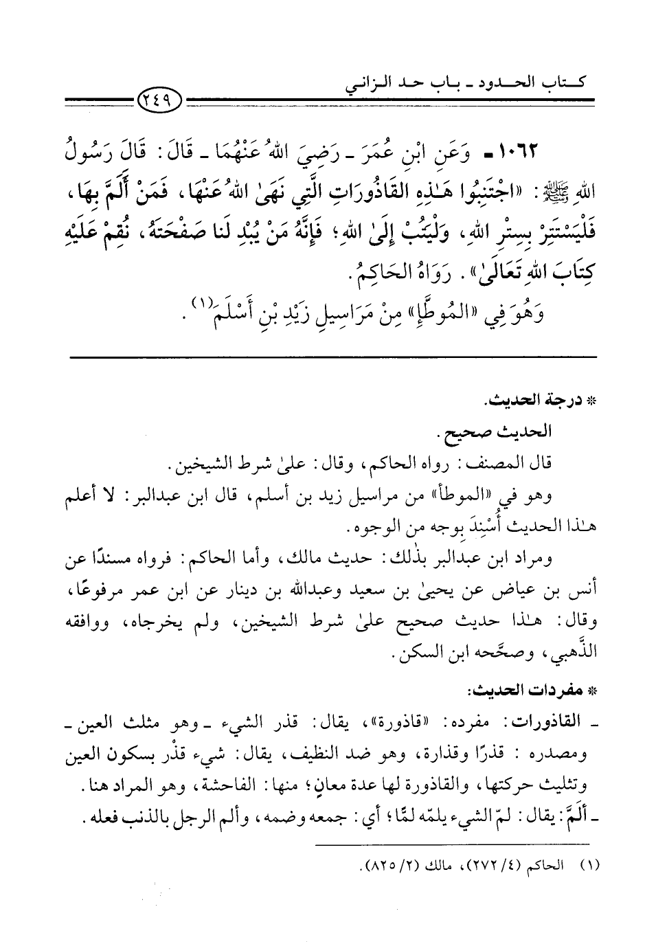 1062 - وَعَنِ ابْنِ عُمَرَ -رَضِيَ اللهُ عَنْهُمَا- قَالَ: قَالَ رَسُولُ اللهِ -صلى الله عليه وسلم-: "اجْتَنِبُوا هَذِهِ القَاذُورَاتِ الَّتِي نَهَى اللهُ عَنْهَا، فَمَنْ أَلَمَّ بِهَا، فَلْيَسْتَتِرْ بسِتْرِ اللهِ، وَلْيَتُبْ إِلَى اللهِ؛ فَإِنَّهُ مَنْ يُبْدِ لَنا صَفْحَتَهُ، نُقِمْ عَلَيْهِ كتَابَ اللهَ تَعَالَى". رَوَاهُ الحَاكِمُ.