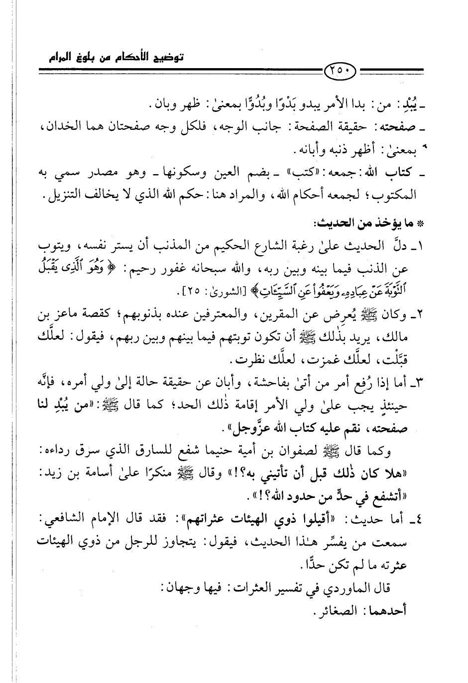 1 - دلَّ الحديث على رغبة الشارع الحكيم من المذنب أن يستر نفسه، ويتوب عن الذنب فيما بينه وبين ربه، والله سبحانه غفور رحيم: {وَهُوَ الَّذِي يَقْبَلُ التَّوْبَةَ عَنْ عِبَادِهِ وَيَعْفُو عَنِ السَّيِّئَاتِ} [الشورى: 25].