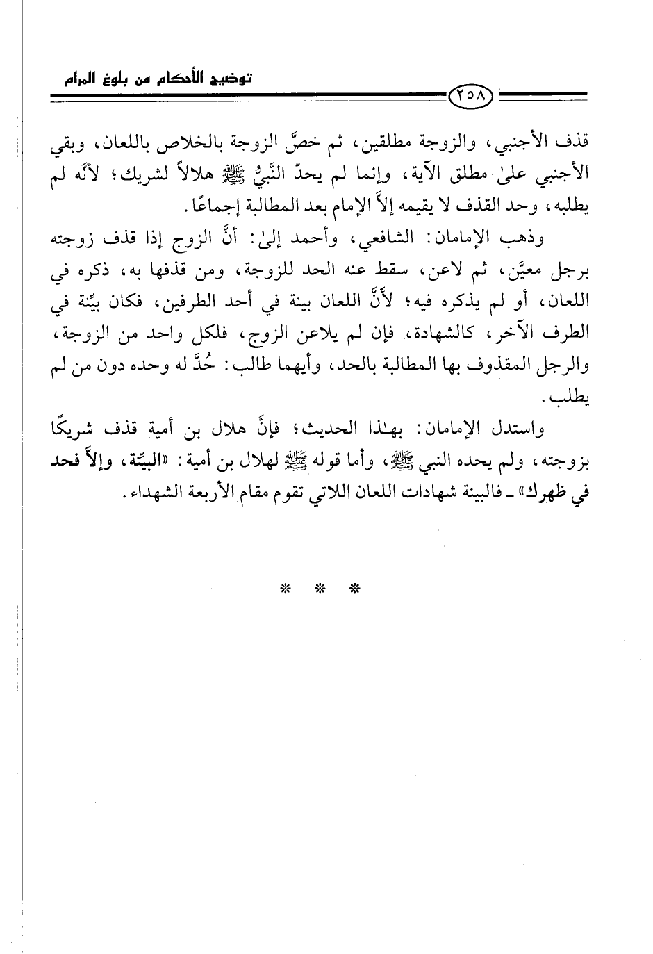 واستدل الإمامان: بهذا الحديث؛ فإنَّ هلال بن أمية قذف شريكًا بزوجته، ولم يحده النبي -صلى الله عليه وسلم-، وأما قوله -صلى الله عليه وسلم- لهلال بن أمية: "البيِّنة، وإلاَّ فحد في ظهرك" -فالبينة شهادات اللعان اللاتي تقوم مقام الأربعة الشهداء.
