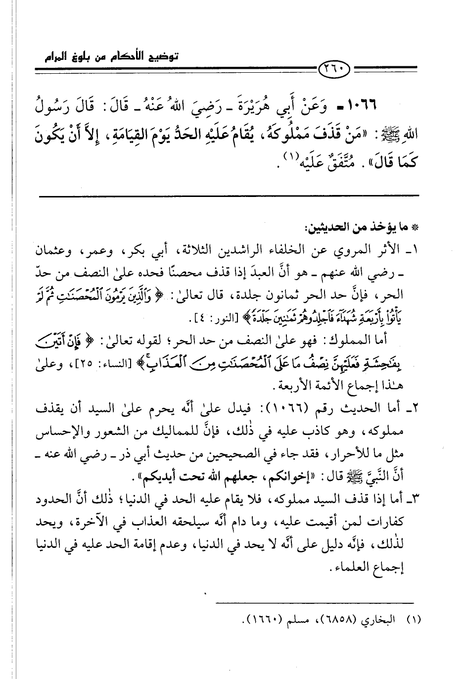 1066 - وَعَنْ أَبِي هُرَيْرَةَ -رَضِيَ اللهُ عَنْهُ- قَالَ: قَالَ رَسُولُ اللهِ -صلى الله عليه وسلم-: "مَنْ قَذَفَ مَمْلُوكَهُ، يُقَامُ عَلَيْهِ الحَدُّ يَوْمَ القِيَامَةِ، إِلاَّ أَنْ يَكُونَ كَمَا قَالَ". مُتَّفَقٌ عَلَيْه (¬1).