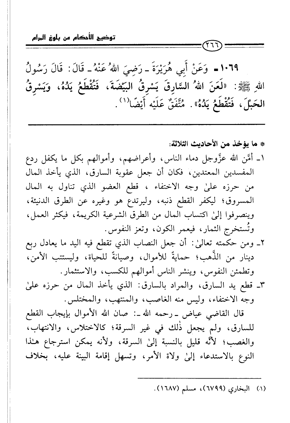 1069 - وَعَنْ أَبِي هُرَيْرَةَ -رَضِيَ اللهُ عَنْهُ- قَالَ: قَالَ رَسُولُ اللهِ -صلى الله عليه وسلم-: "لَعَنَ اللهُ السَّارِقَ يَسْرِقُ البَيْضَةَ، فَتُقْطَعُ يَدُهُ، وَيَسْرِقُ الحَبْلَ، فَتُقْطَعُ يَدُهُ". مُتَّفَقٌ عَلَيْه أَيْضًا (¬1).