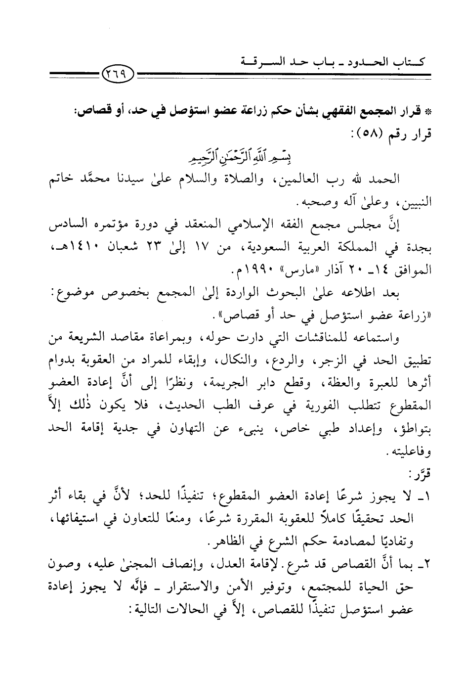 * قرار المجمع الفقهي بشأن حكم زراعة عضو استؤصل في حد، أو قصاص: قرار رقم (58):